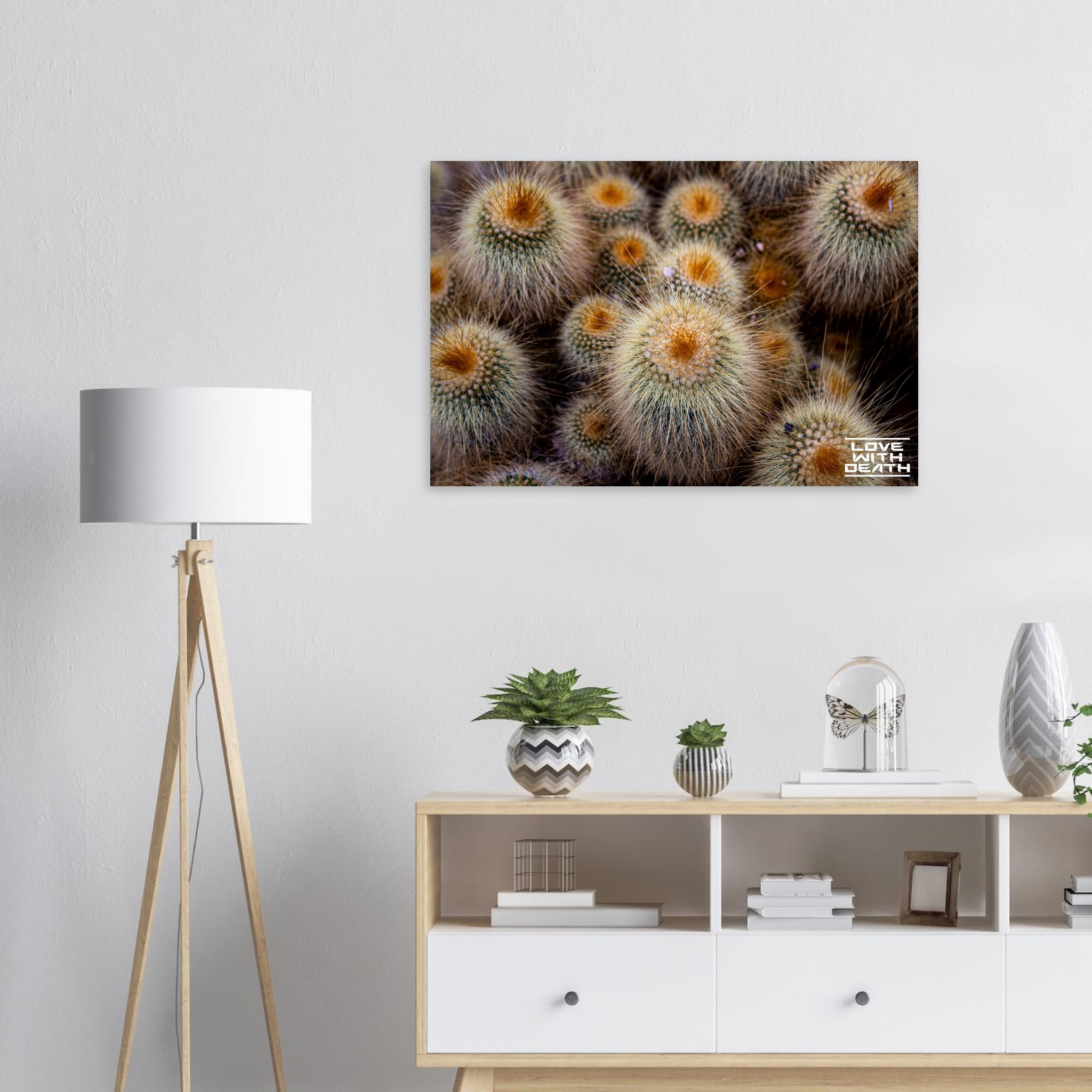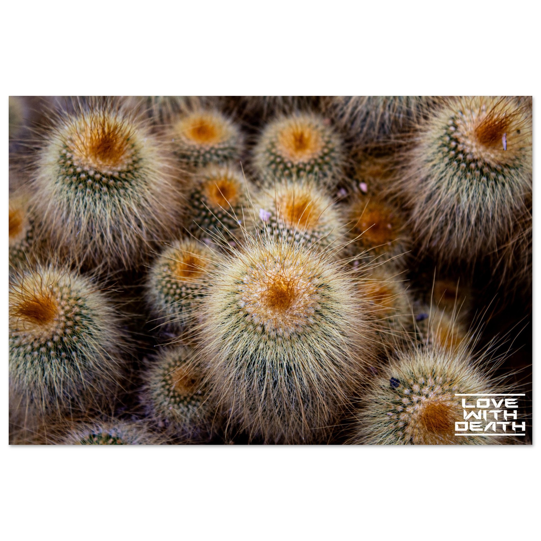 This close-up captures the fascinating texture and structure of spherical cacti, with their soft, spiky surfaces glowing in warm yellow and green tones. A symbol of resilience and adaptability in harsh environments.