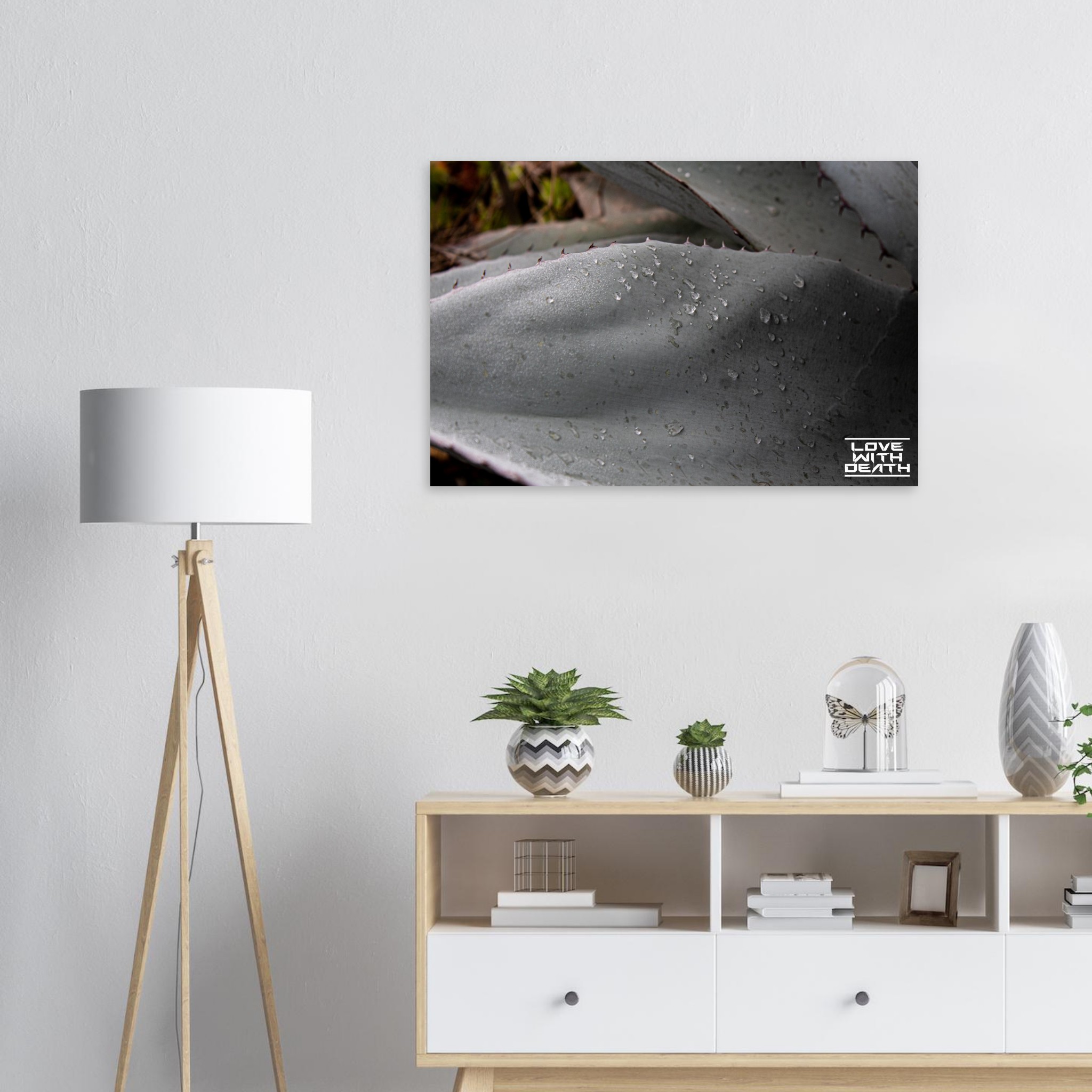 A captivating view of raindrops delicately settled on the spiked leaf of an agave after rain. The soft, matte texture of the leaf contrasts beautifully with the clear, sparkling droplets.