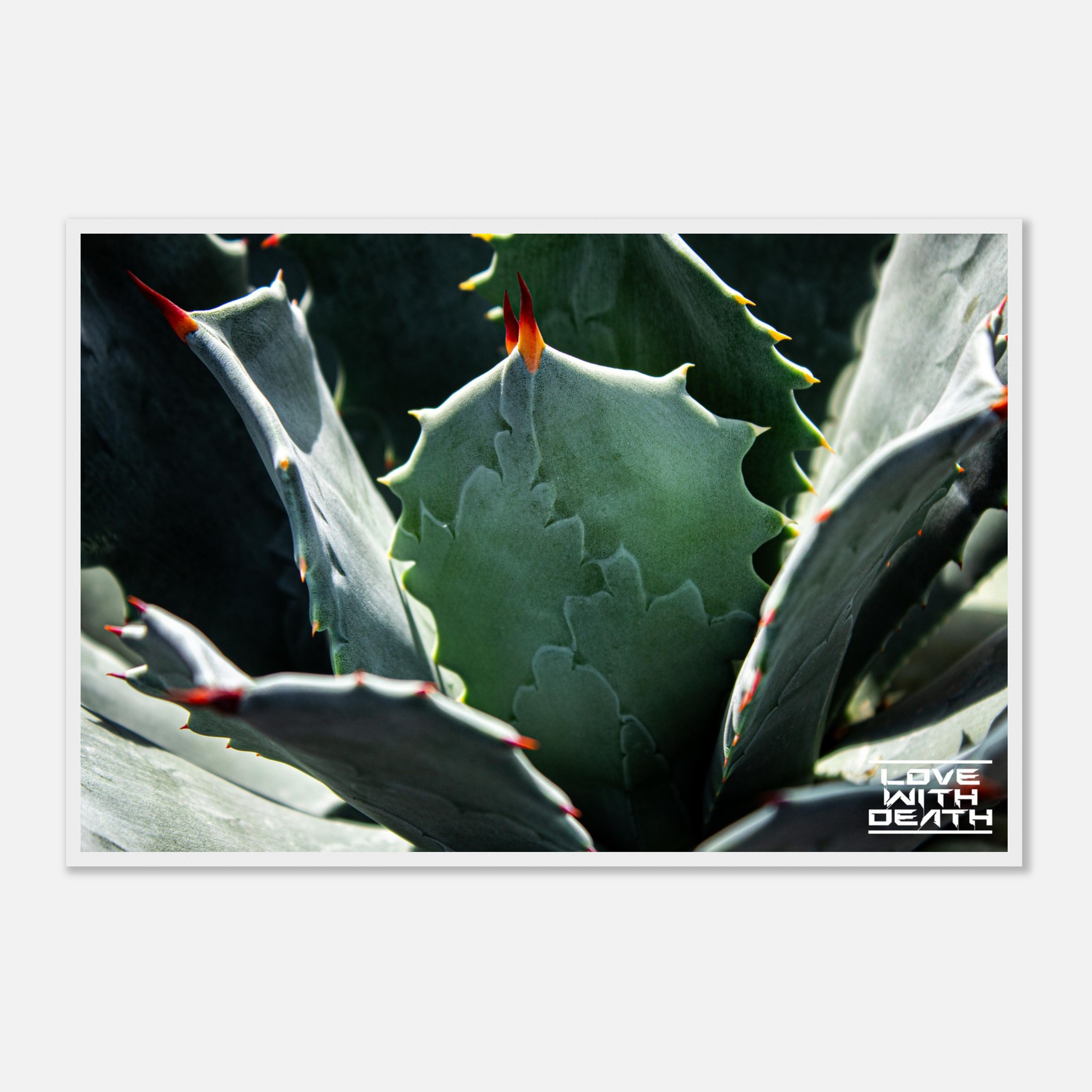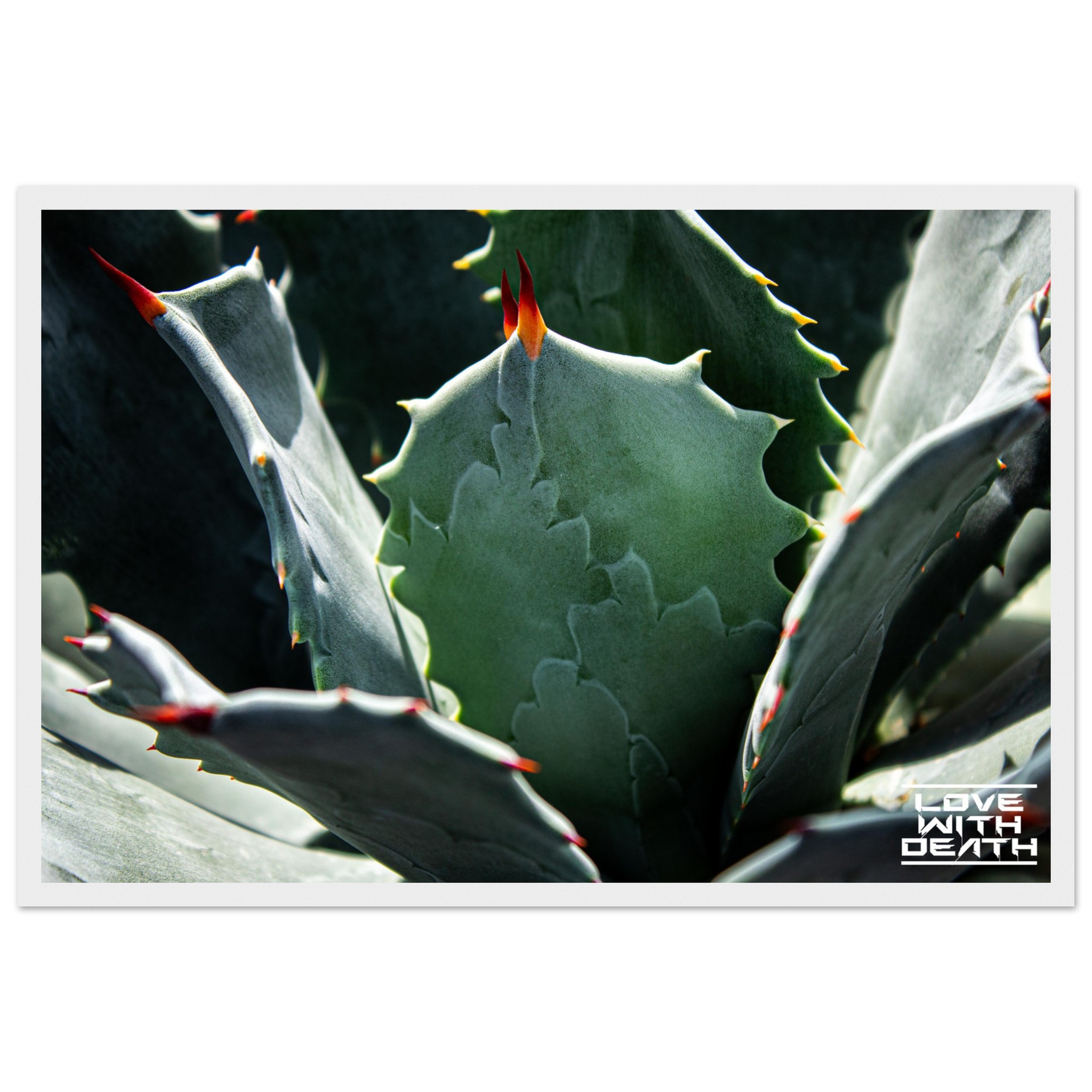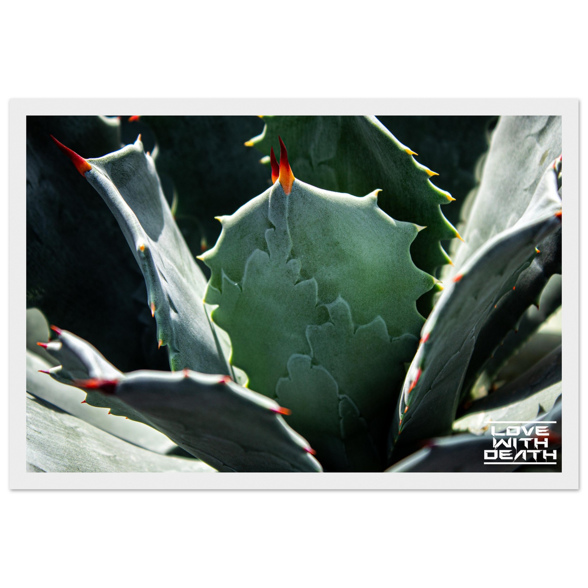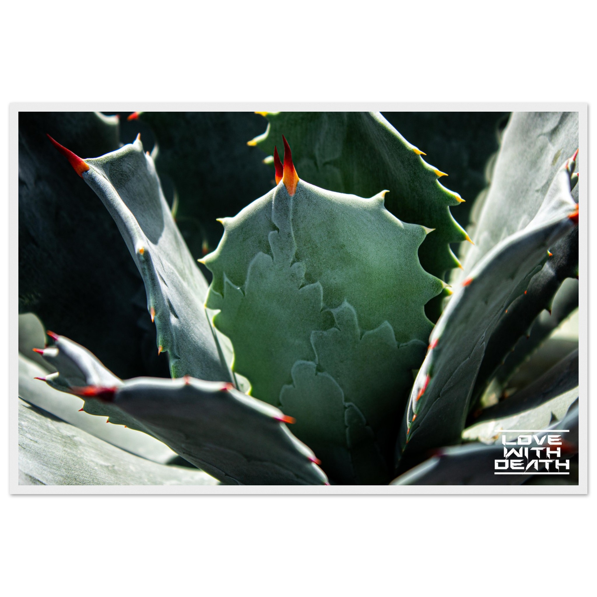 This close-up captures the unparalleled beauty of an agave plant. The thick, greenish-blue leaves with their bright red tips create a striking contrast. The detailed leaf edges and textured surface draw the eye, showcasing nature’s harmony in its full glory. An image that radiates both tranquility and strength.