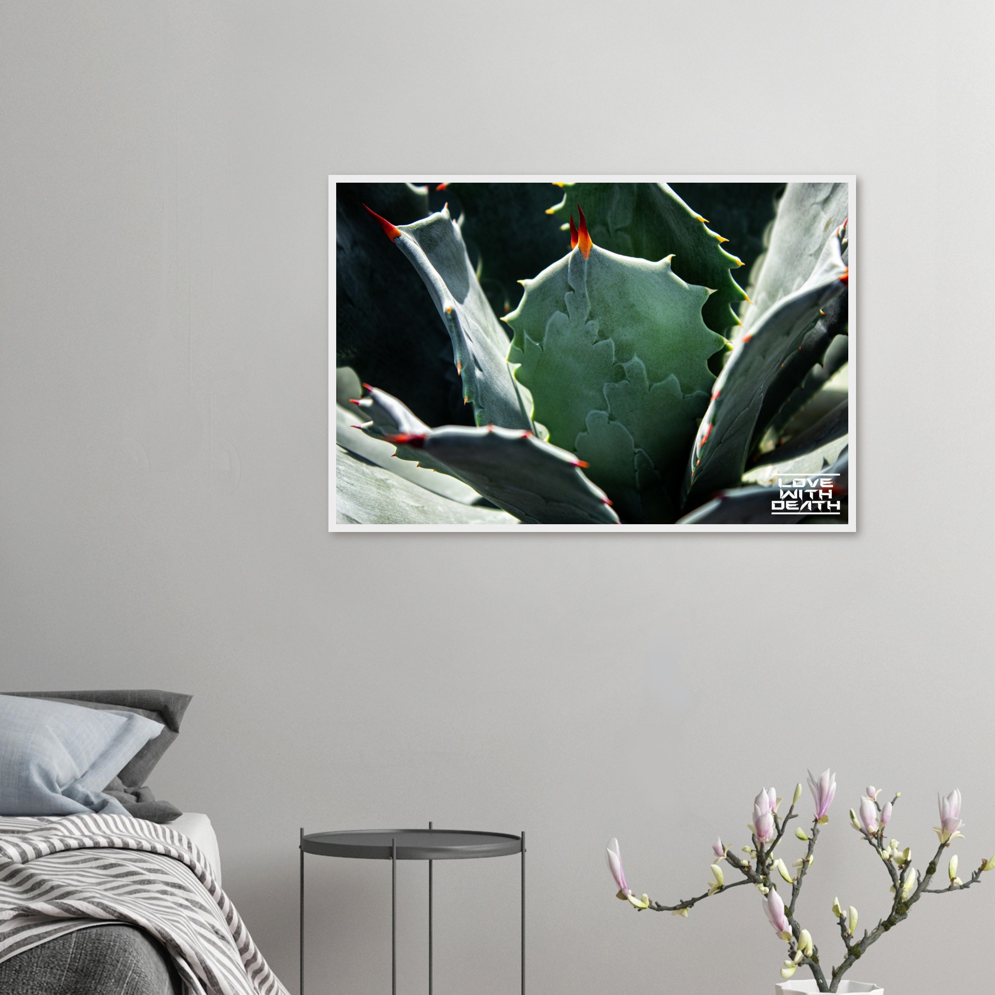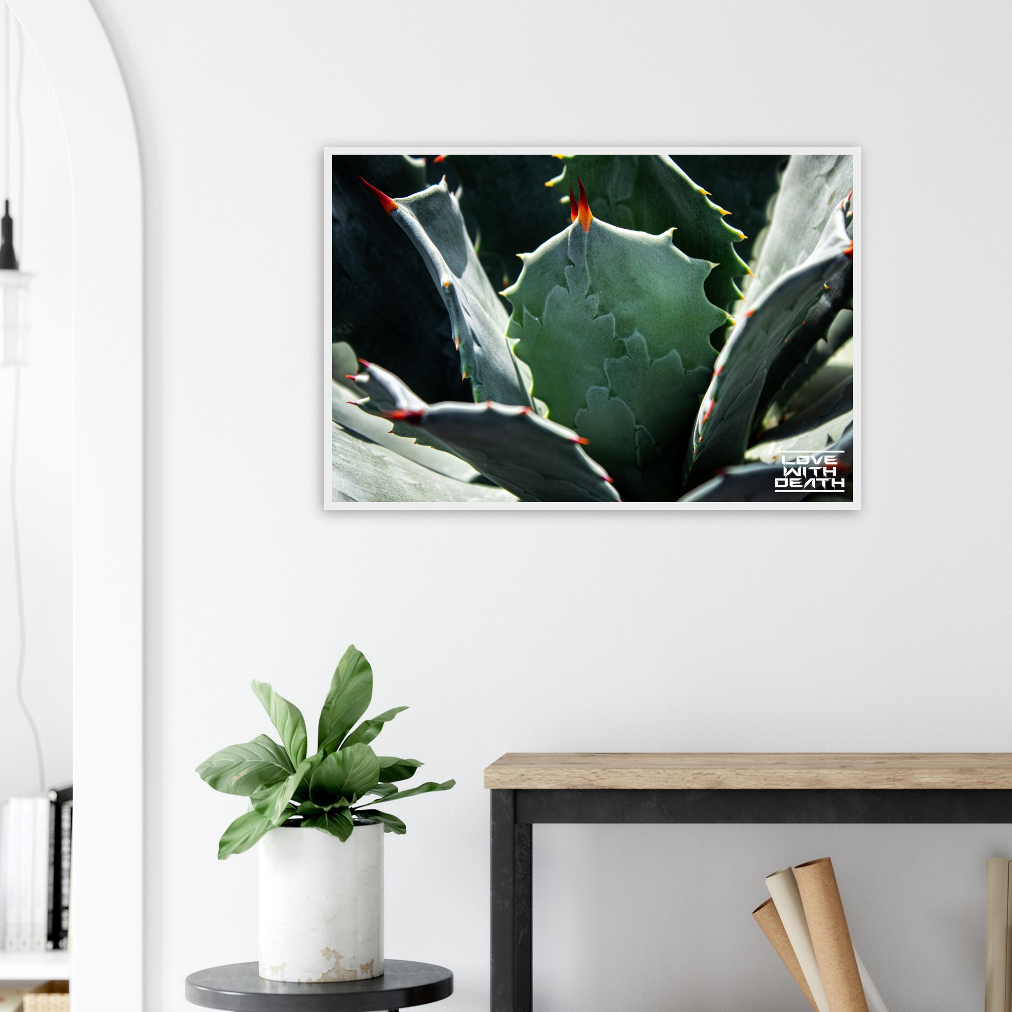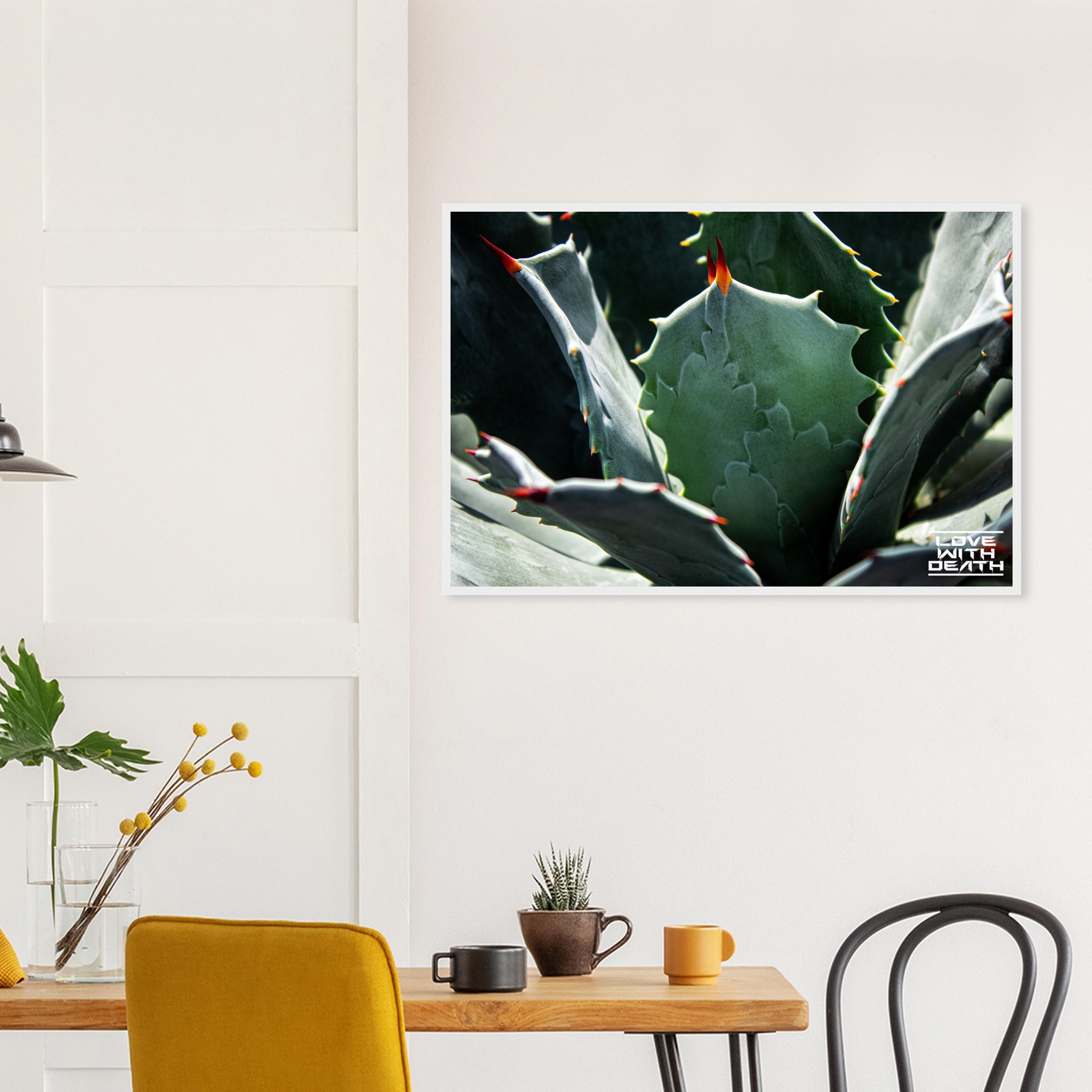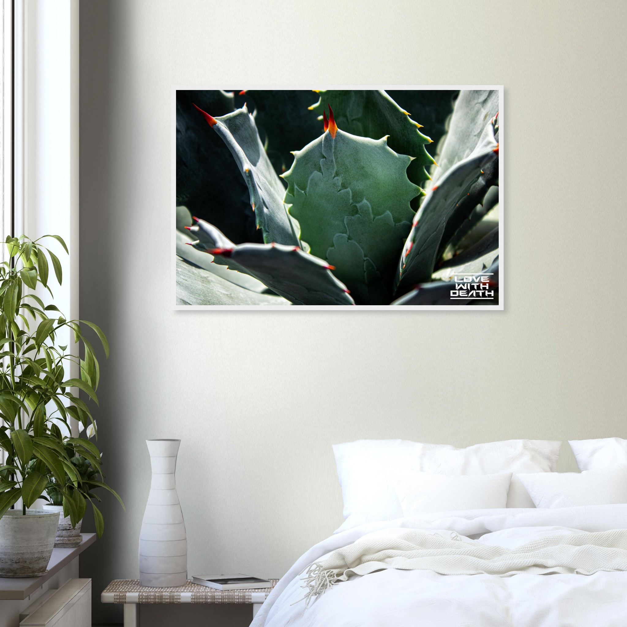 This close-up captures the unparalleled beauty of an agave plant. The thick, greenish-blue leaves with their bright red tips create a striking contrast. The detailed leaf edges and textured surface draw the eye, showcasing nature’s harmony in its full glory. An image that radiates both tranquility and strength.