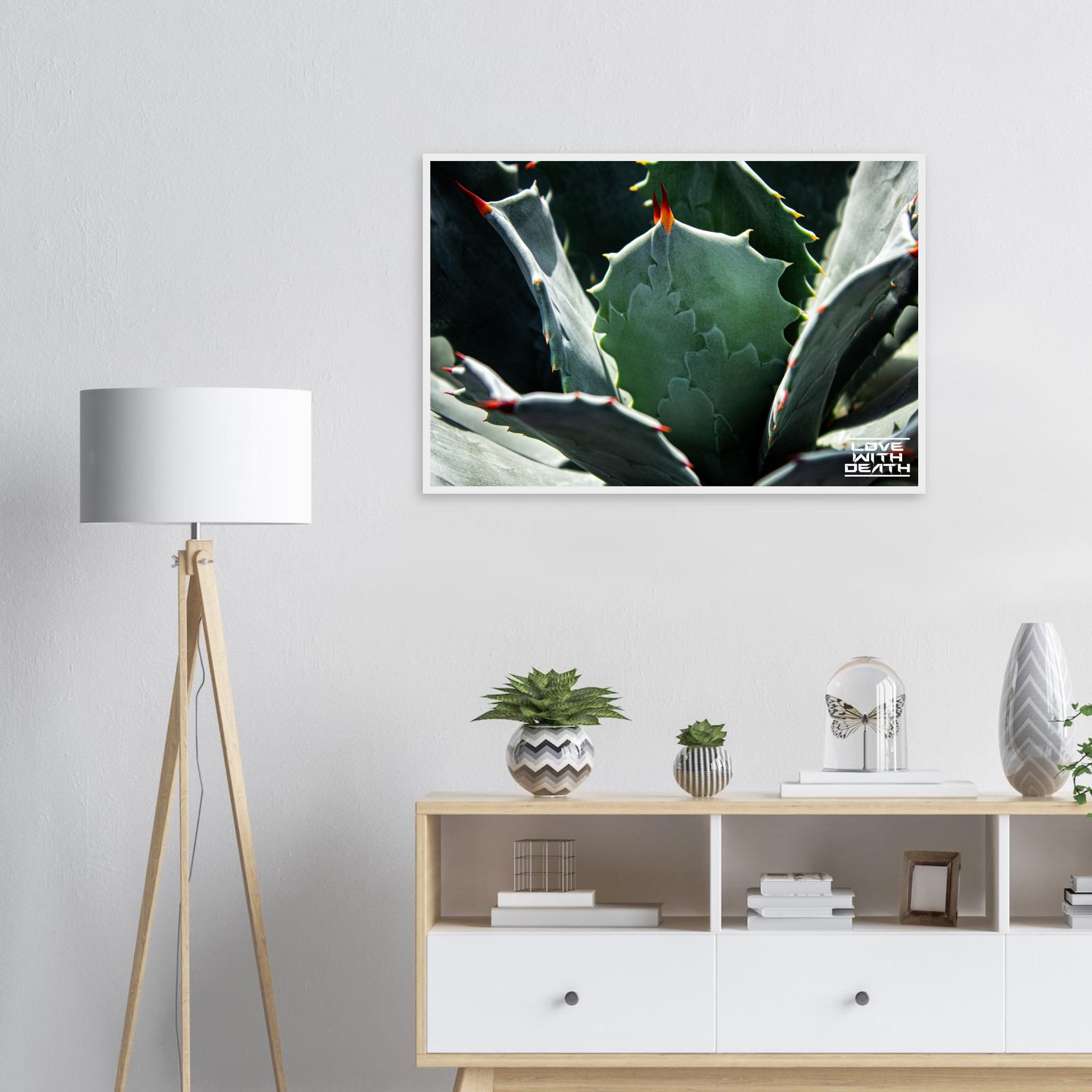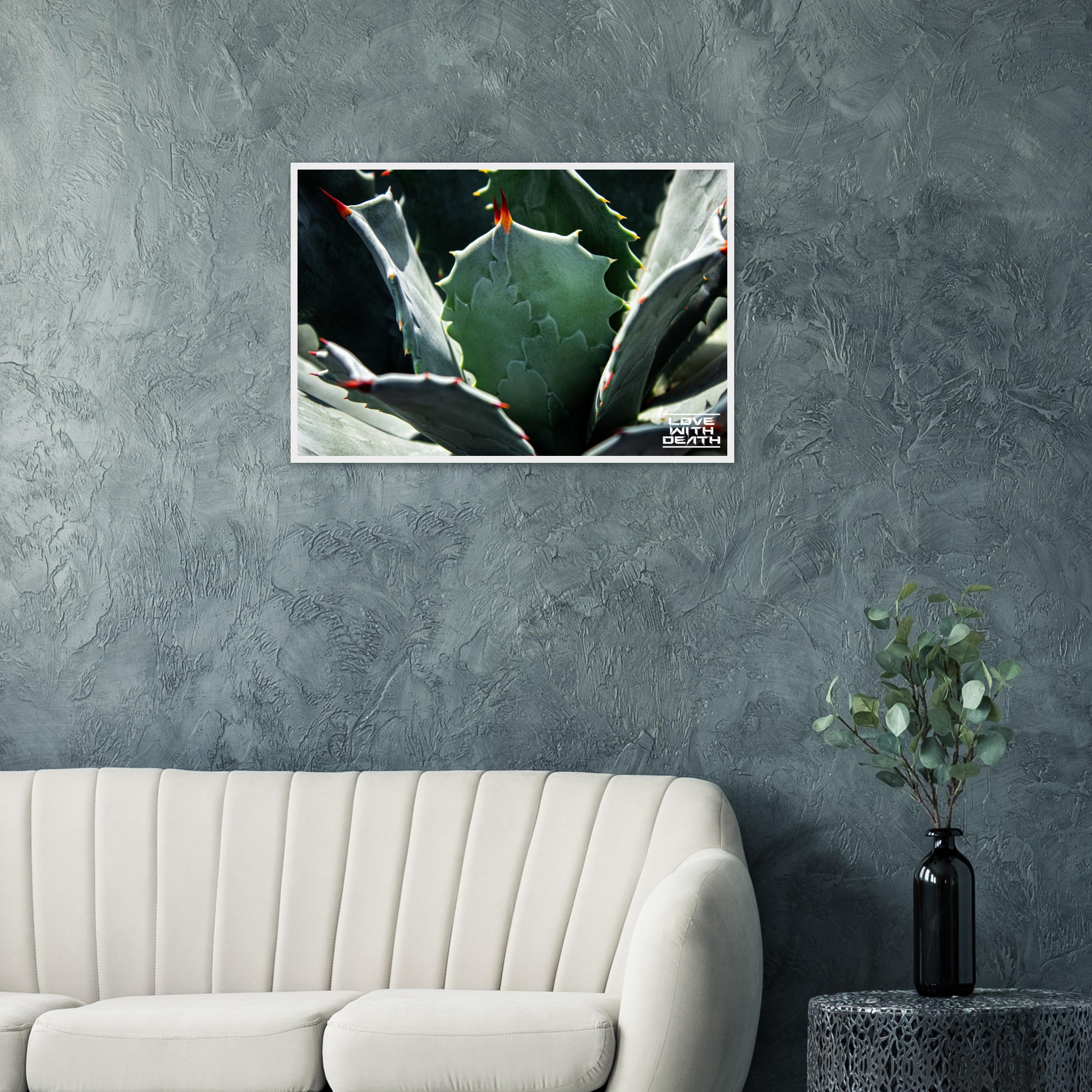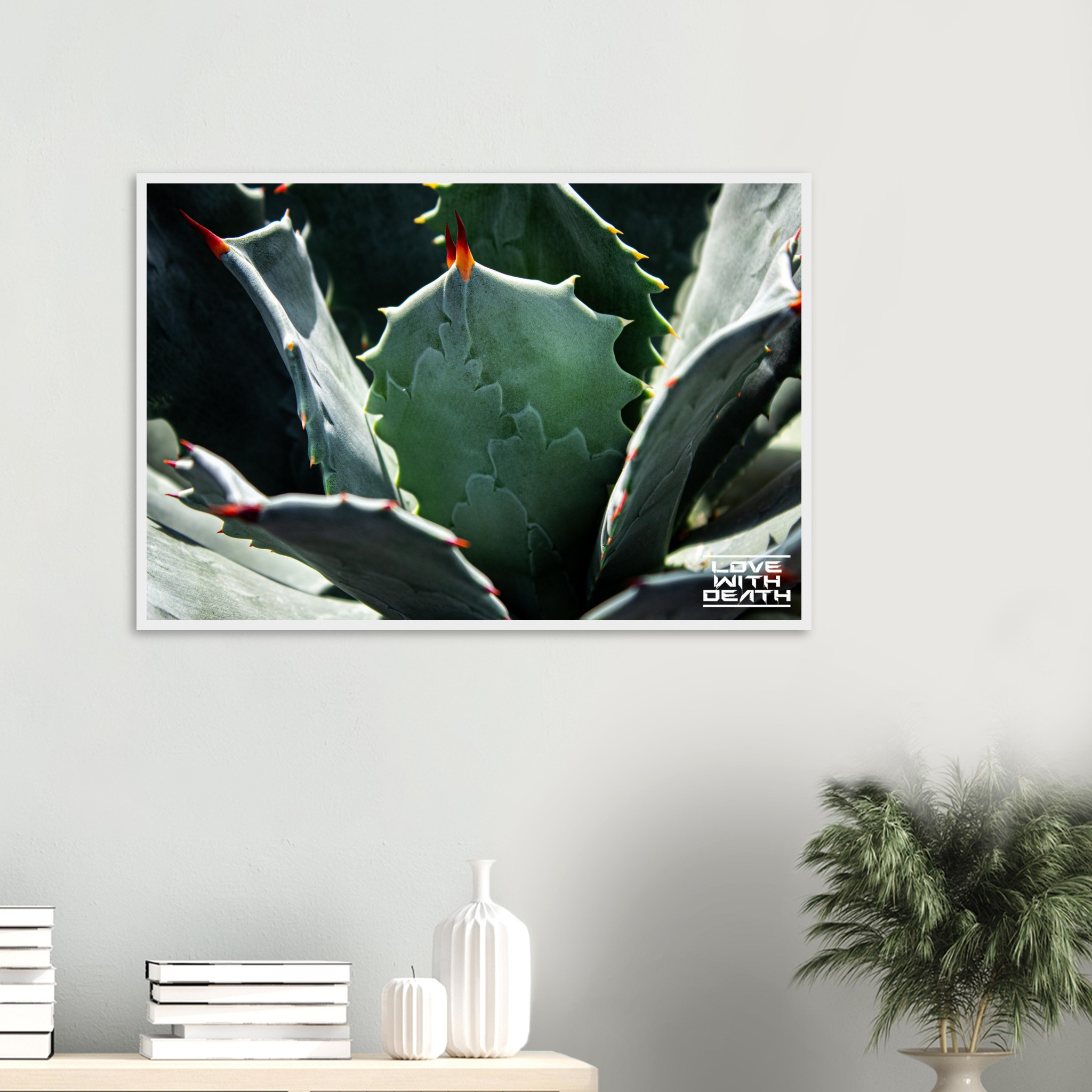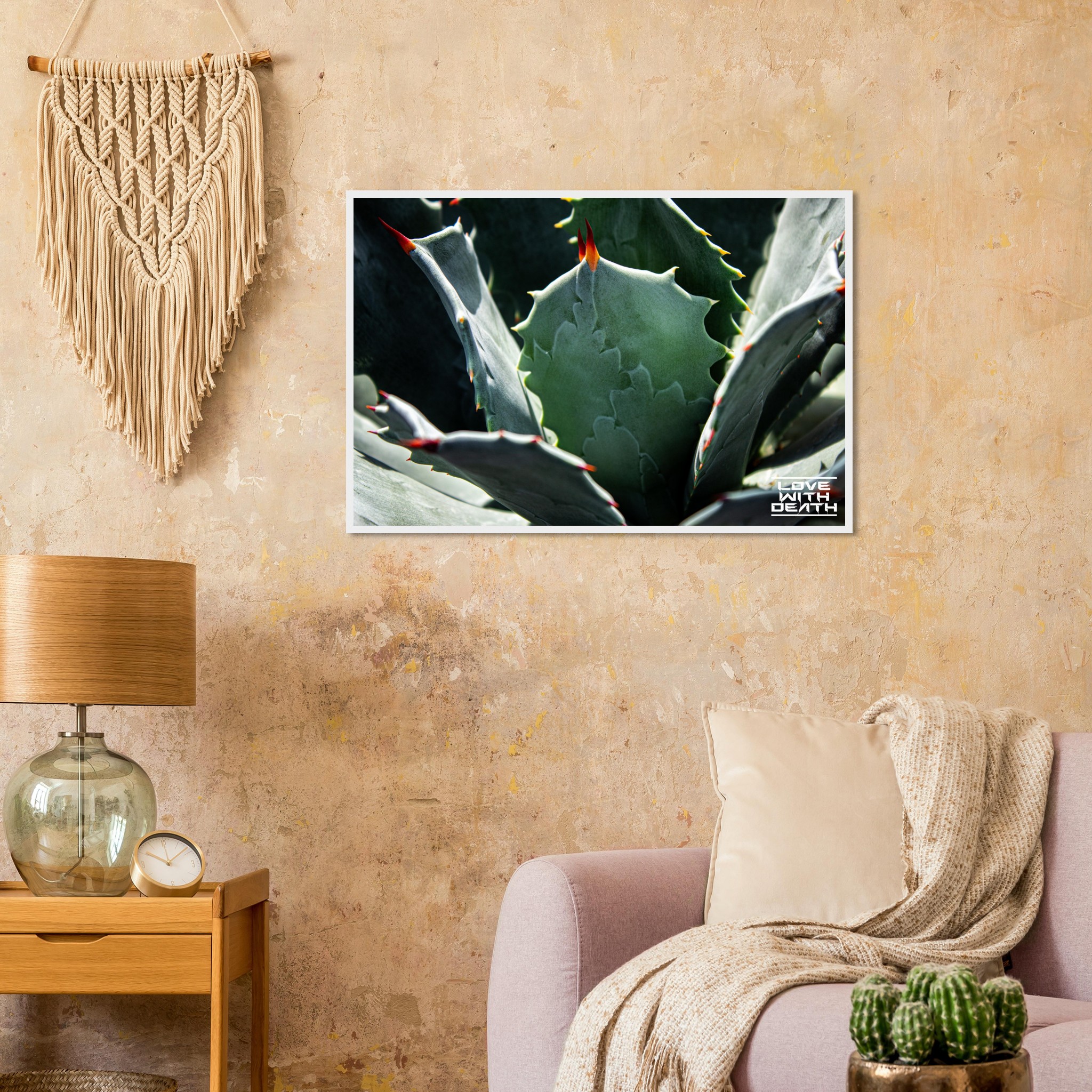 This close-up captures the unparalleled beauty of an agave plant. The thick, greenish-blue leaves with their bright red tips create a striking contrast. The detailed leaf edges and textured surface draw the eye, showcasing nature’s harmony in its full glory. An image that radiates both tranquility and strength.