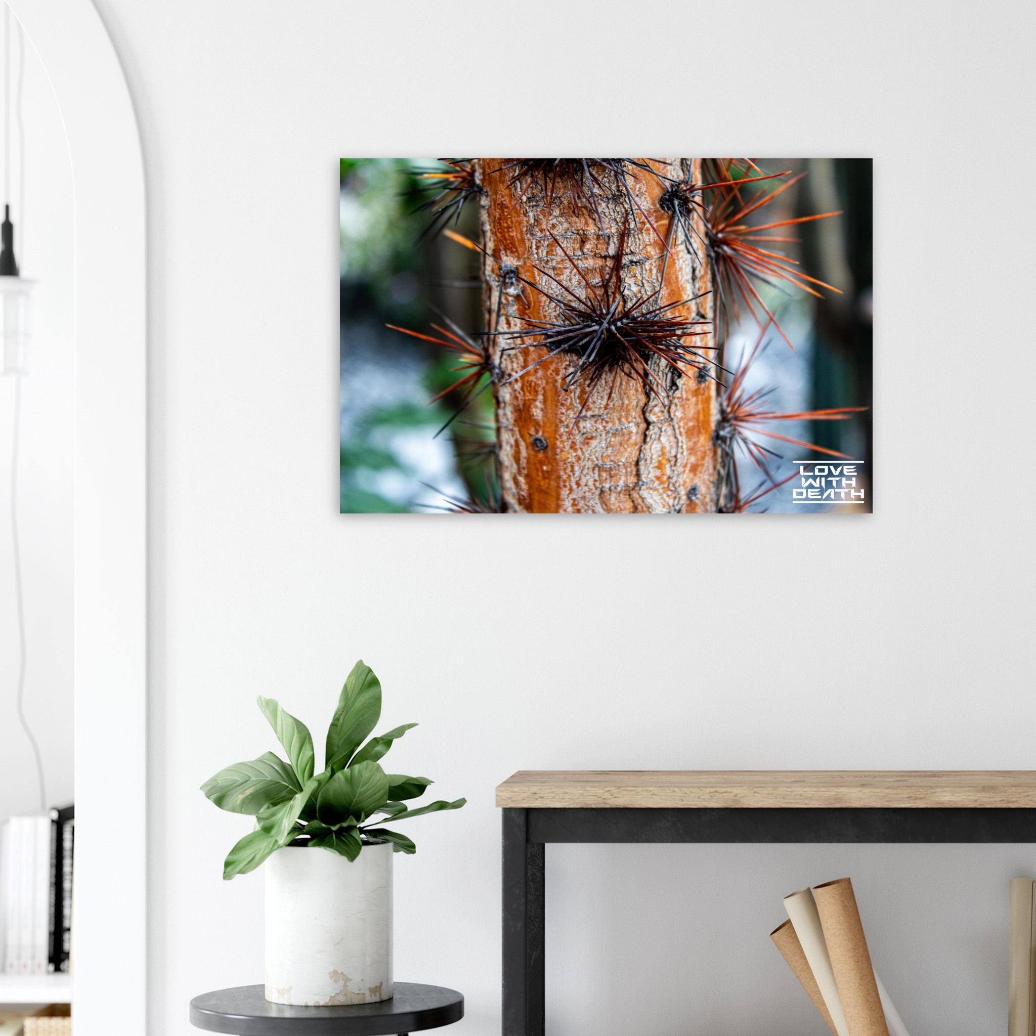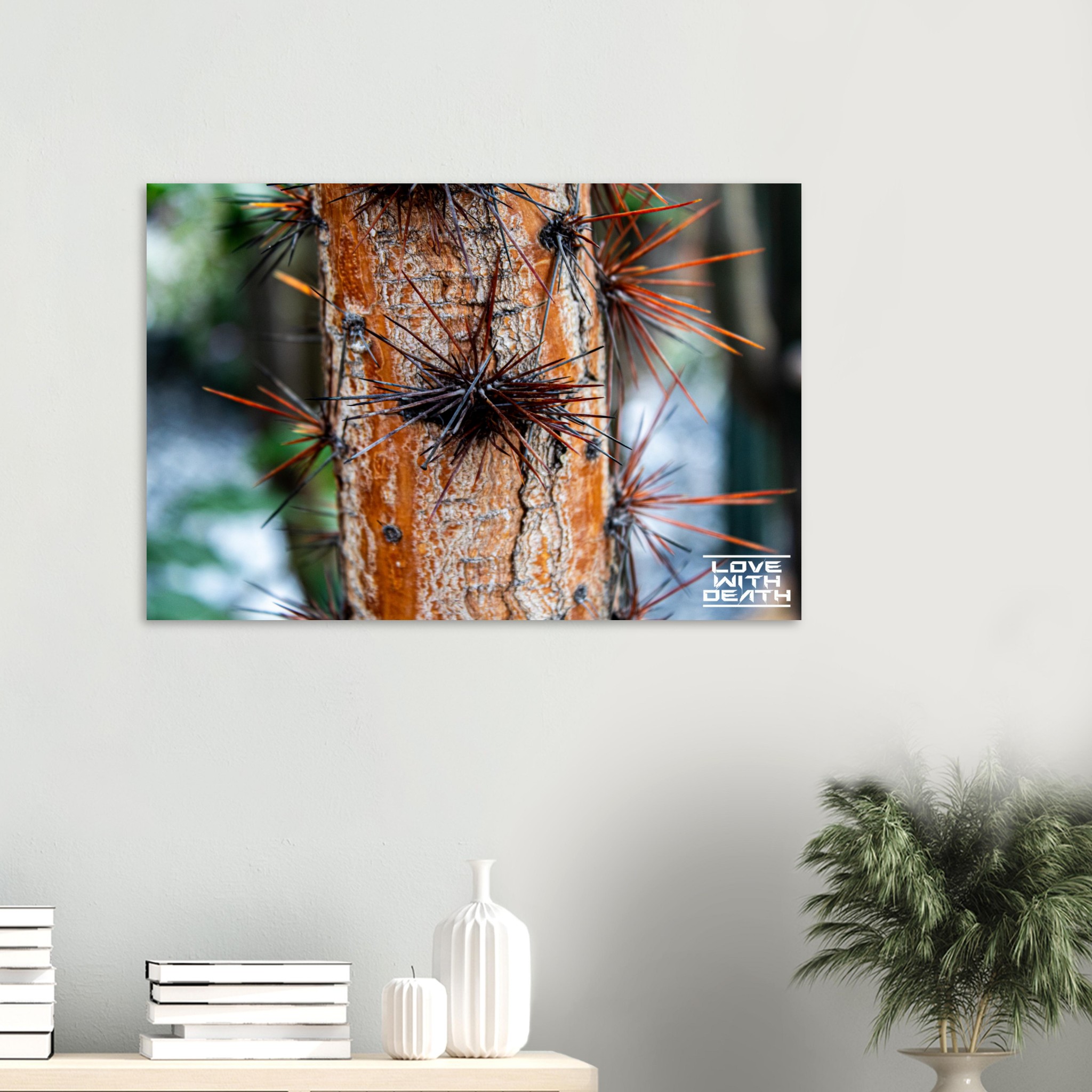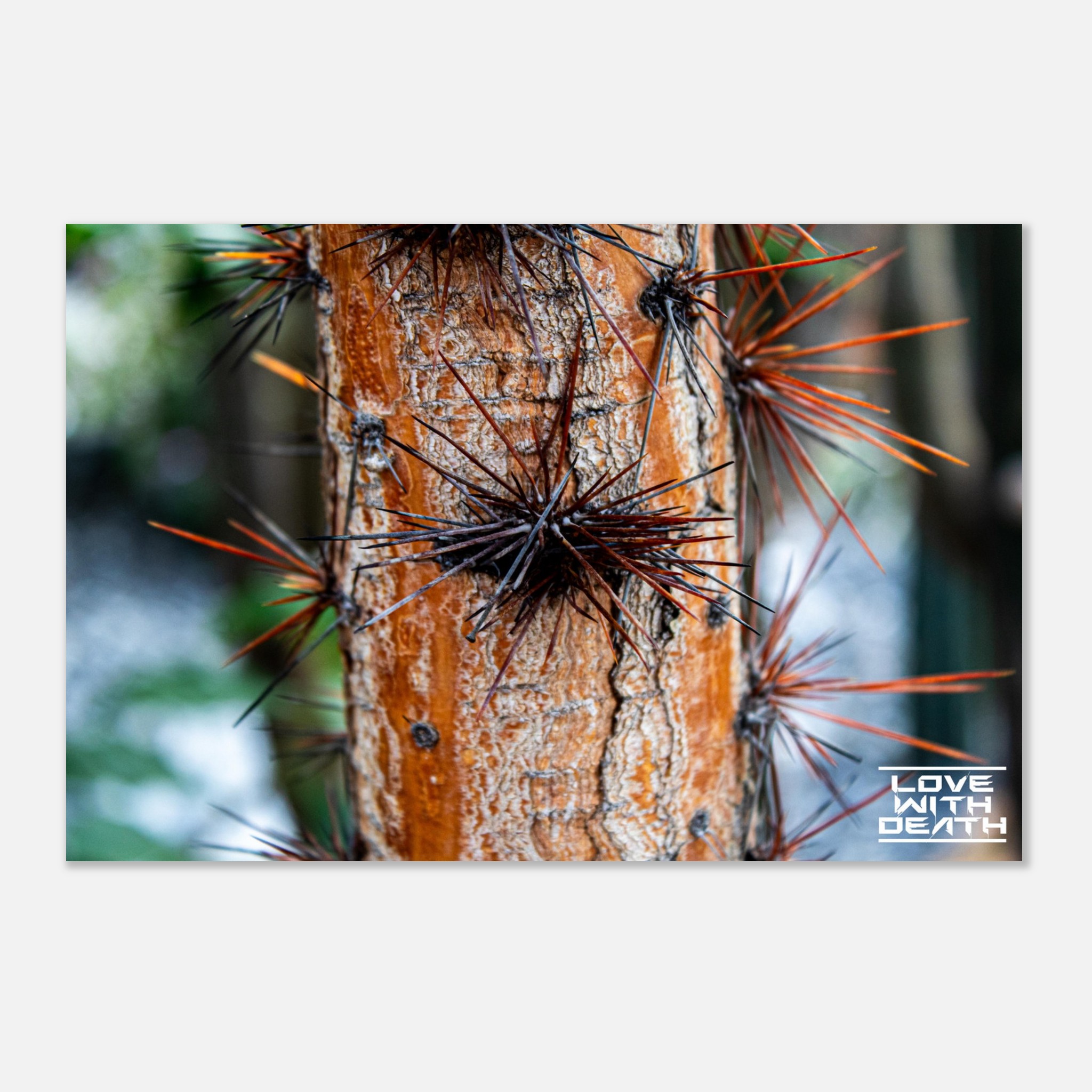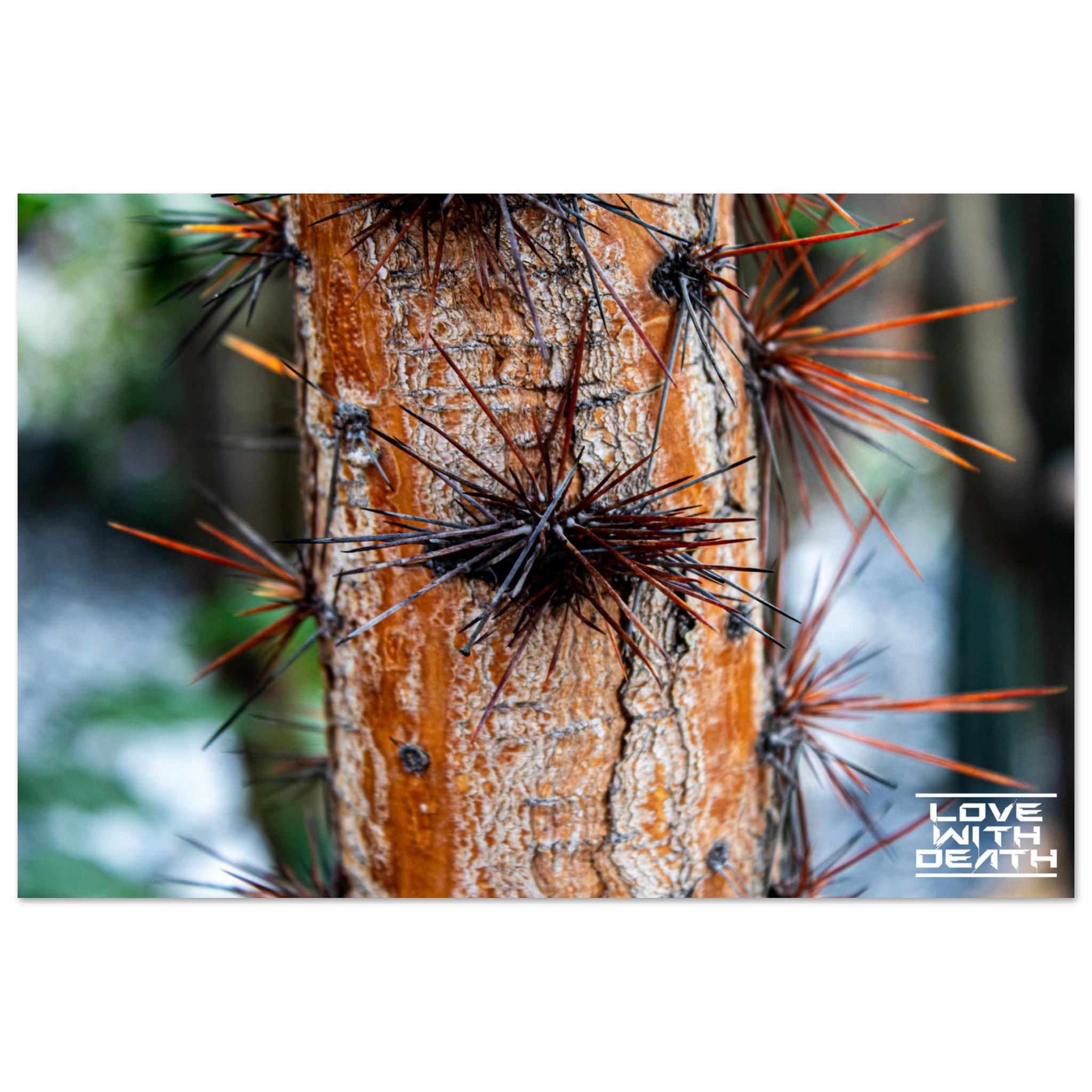 This striking tree trunk is adorned with long, sharp thorns, resembling a natural armor. The warm orange tones of the bark create a bold contrast with the dark and rust-colored thorns, while the rough texture of the bark emphasizes nature’s toughness and resilience.