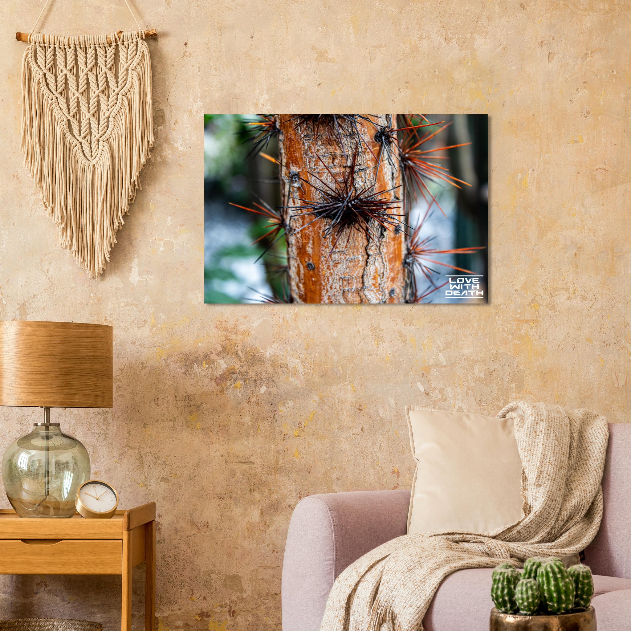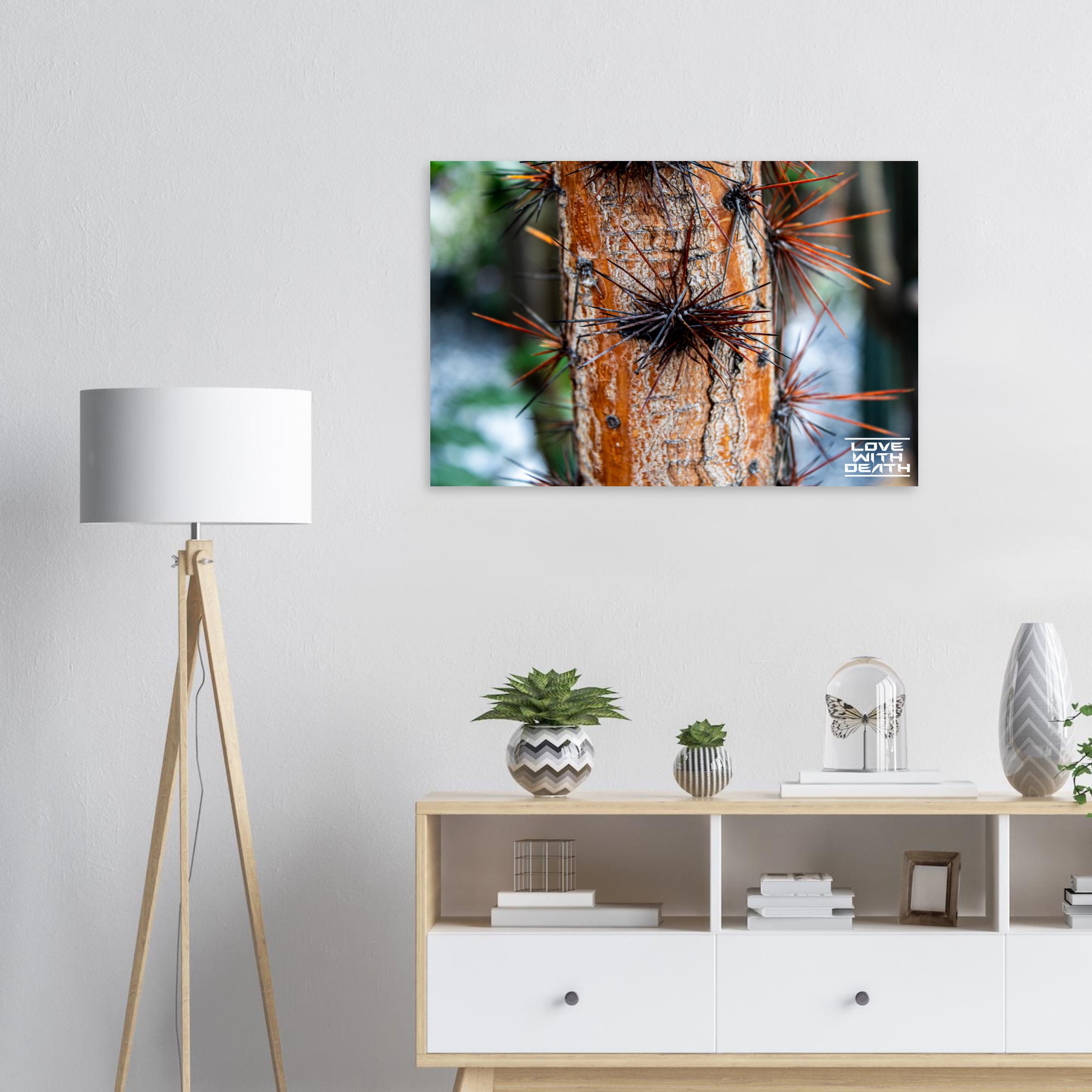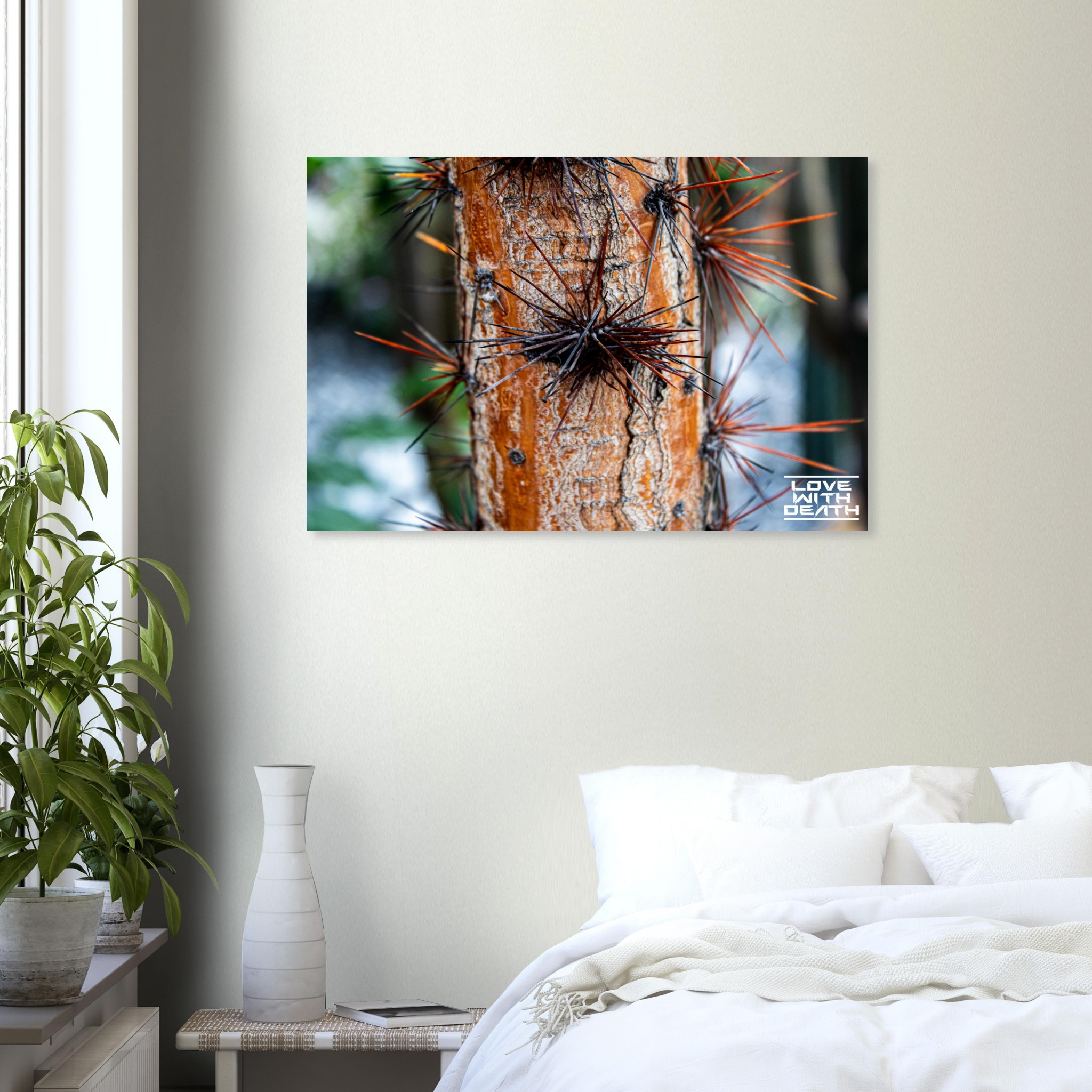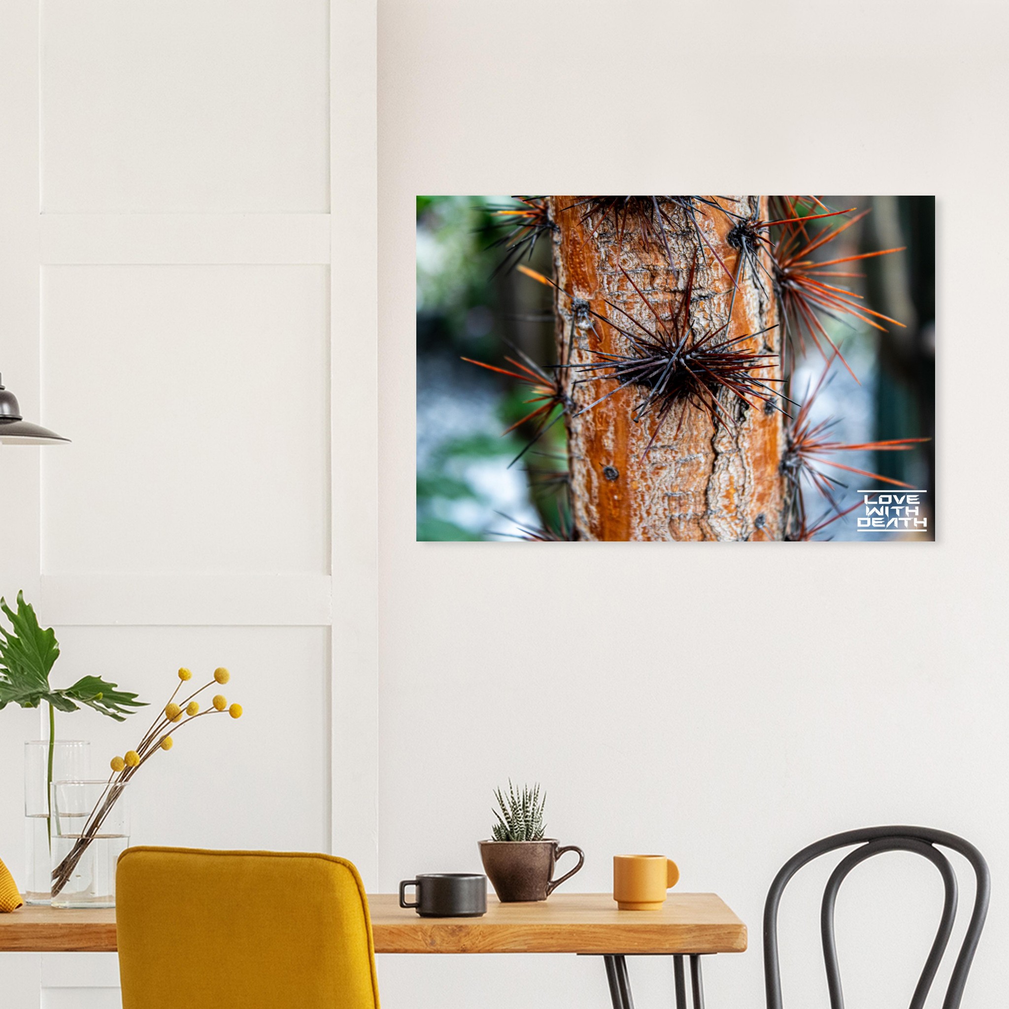 This striking tree trunk is adorned with long, sharp thorns, resembling a natural armor. The warm orange tones of the bark create a bold contrast with the dark and rust-colored thorns, while the rough texture of the bark emphasizes nature’s toughness and resilience.