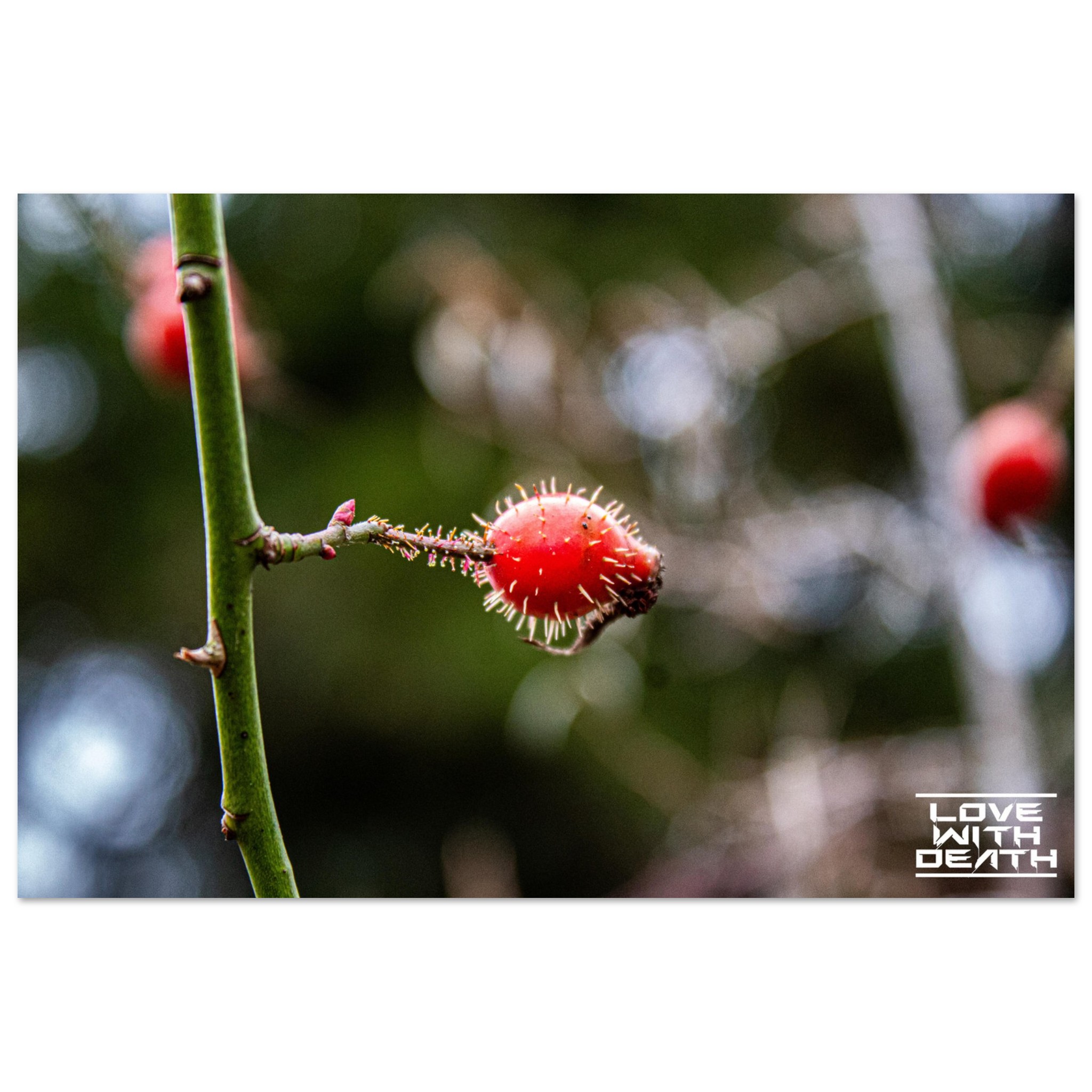 A close-up of a red rosehip, characterized by its fine, spike-like structures. The soft, blurred background emphasizes the vibrancy of the colors and details of the rosehip. This image perfectly captures the contrast between nature’s delicacy and resilience.