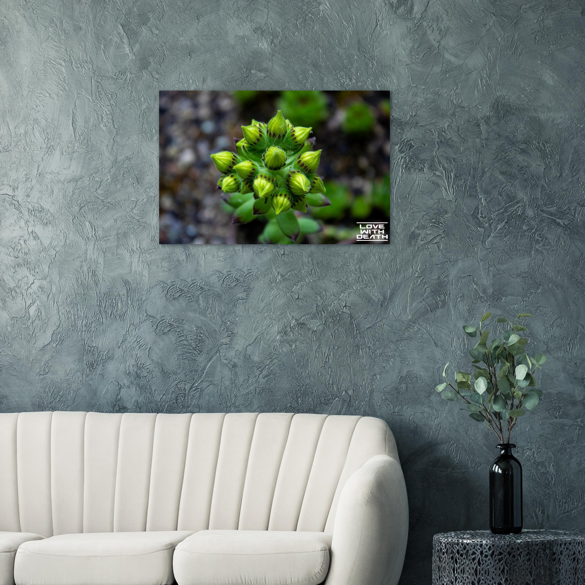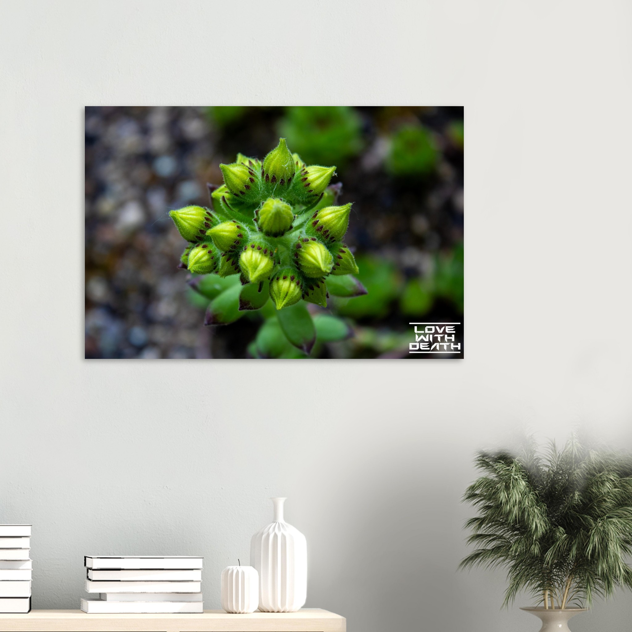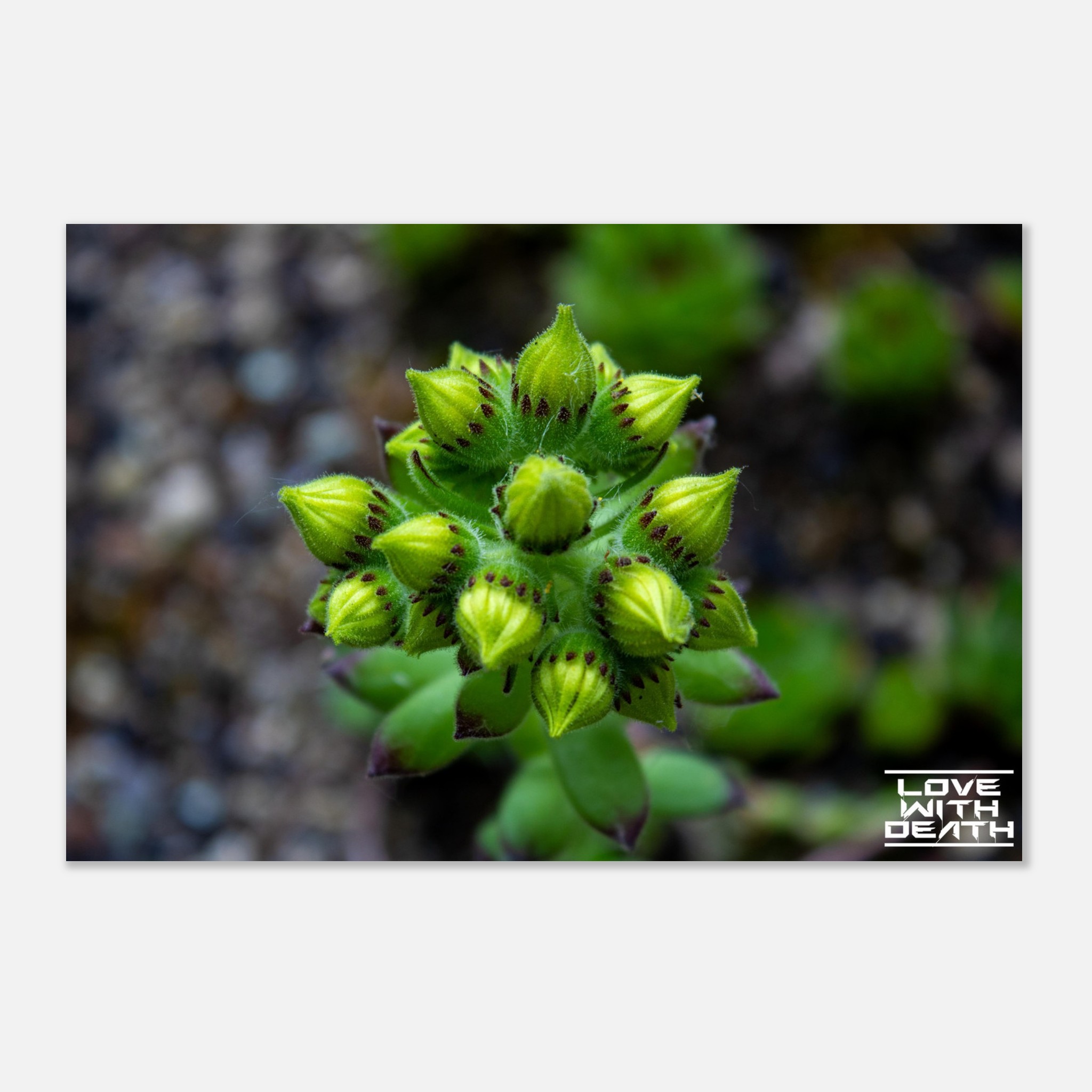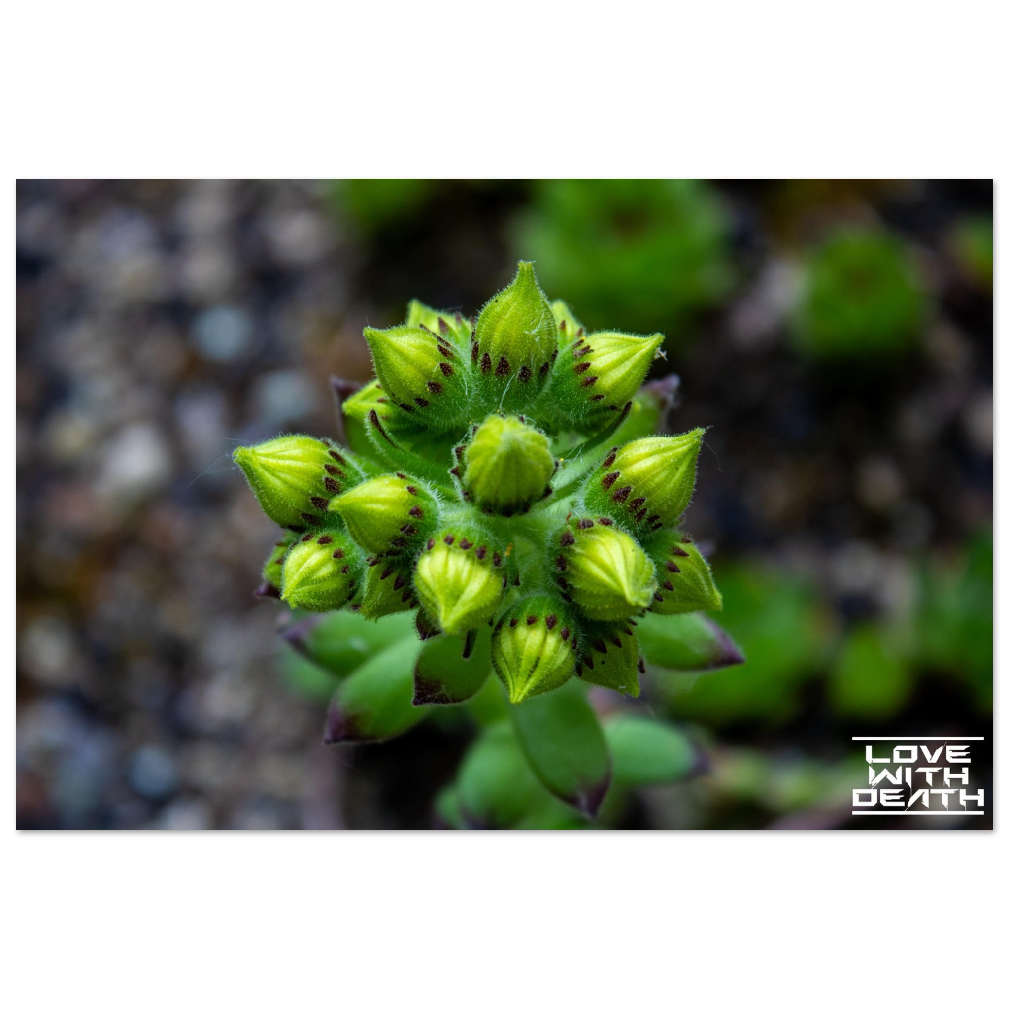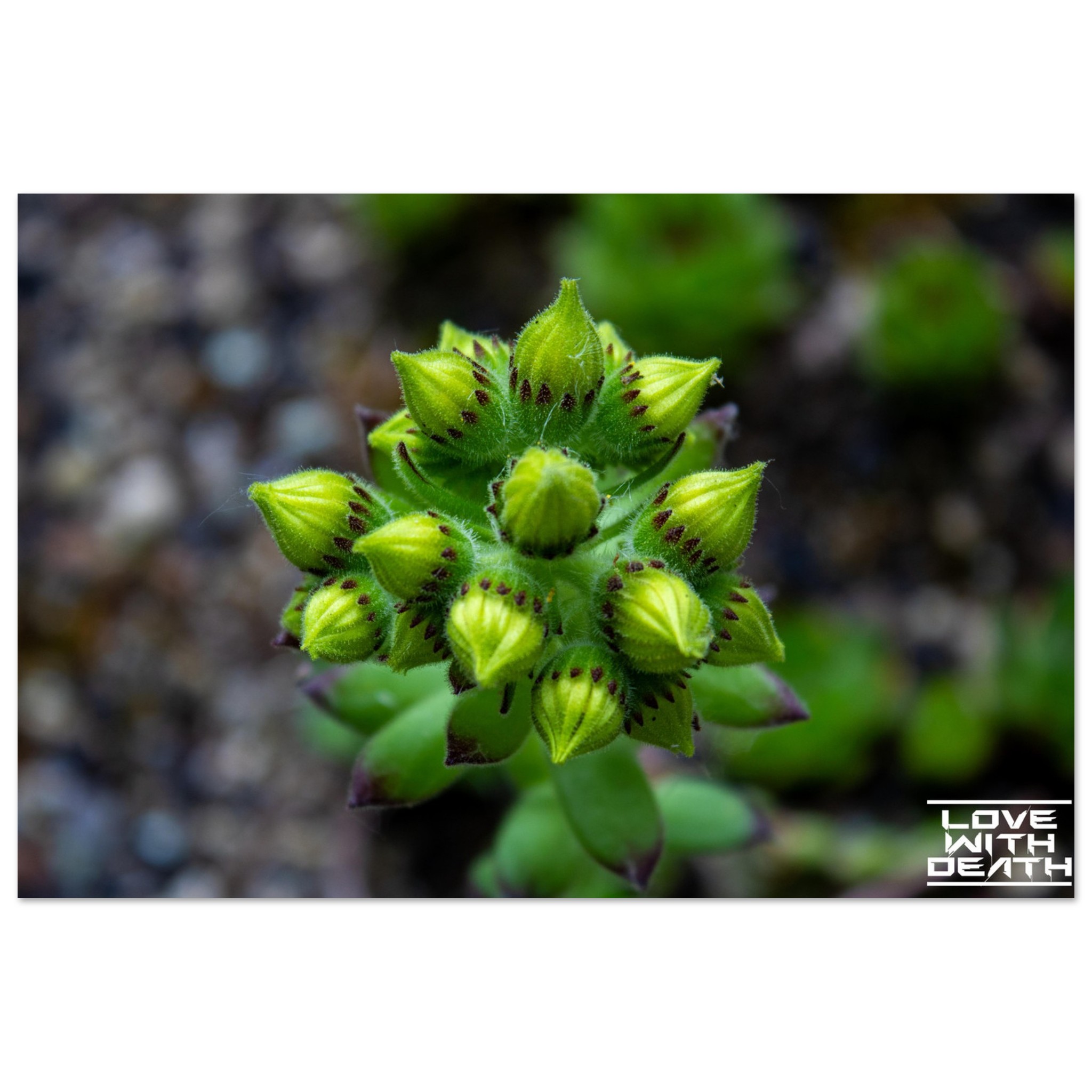 A close-up of succulent buds on the verge of blooming. The rich green tones of the buds, combined with delicate purple accents, stand out against the soft, earthy background. This image captures the magic and detail of nature in its early growth phase.