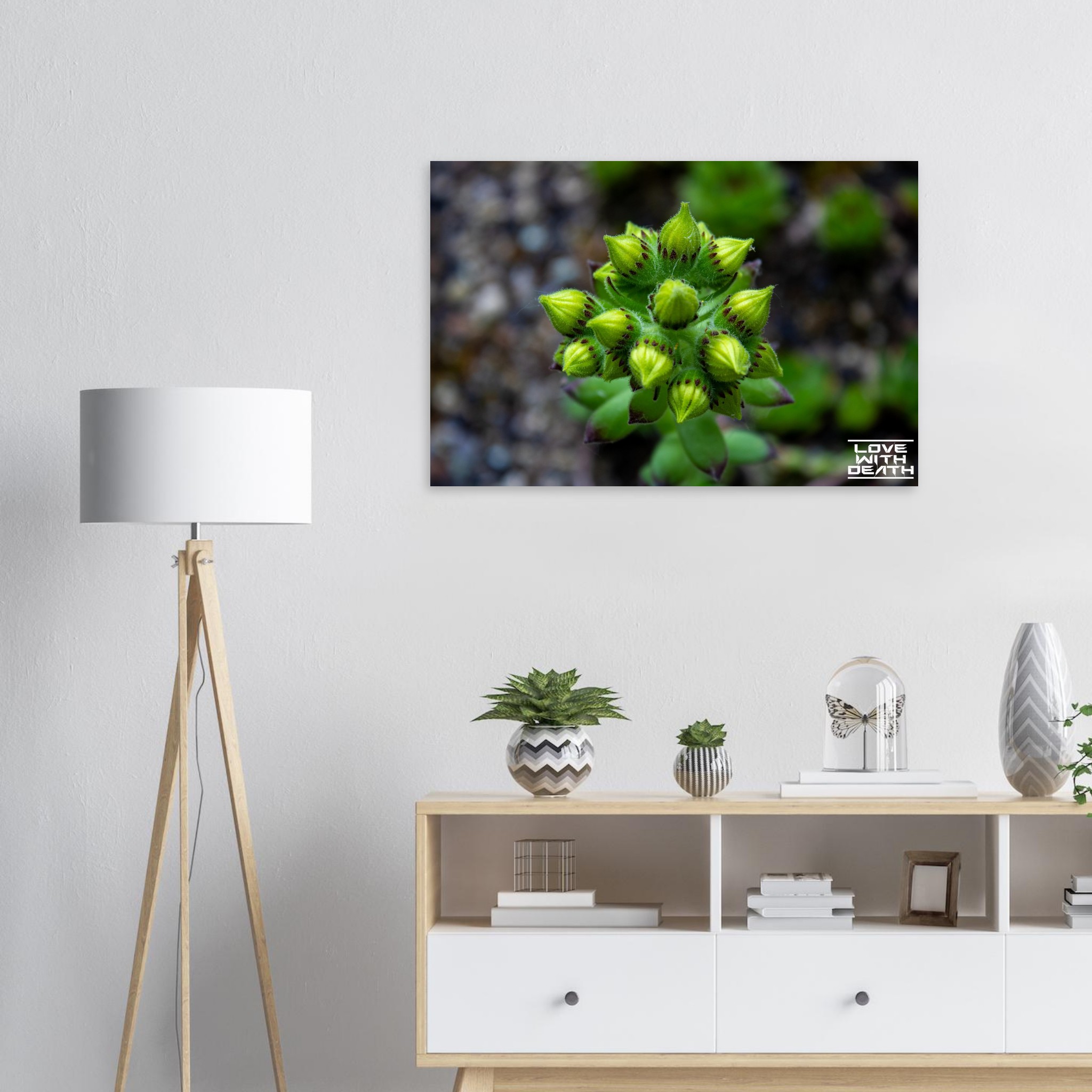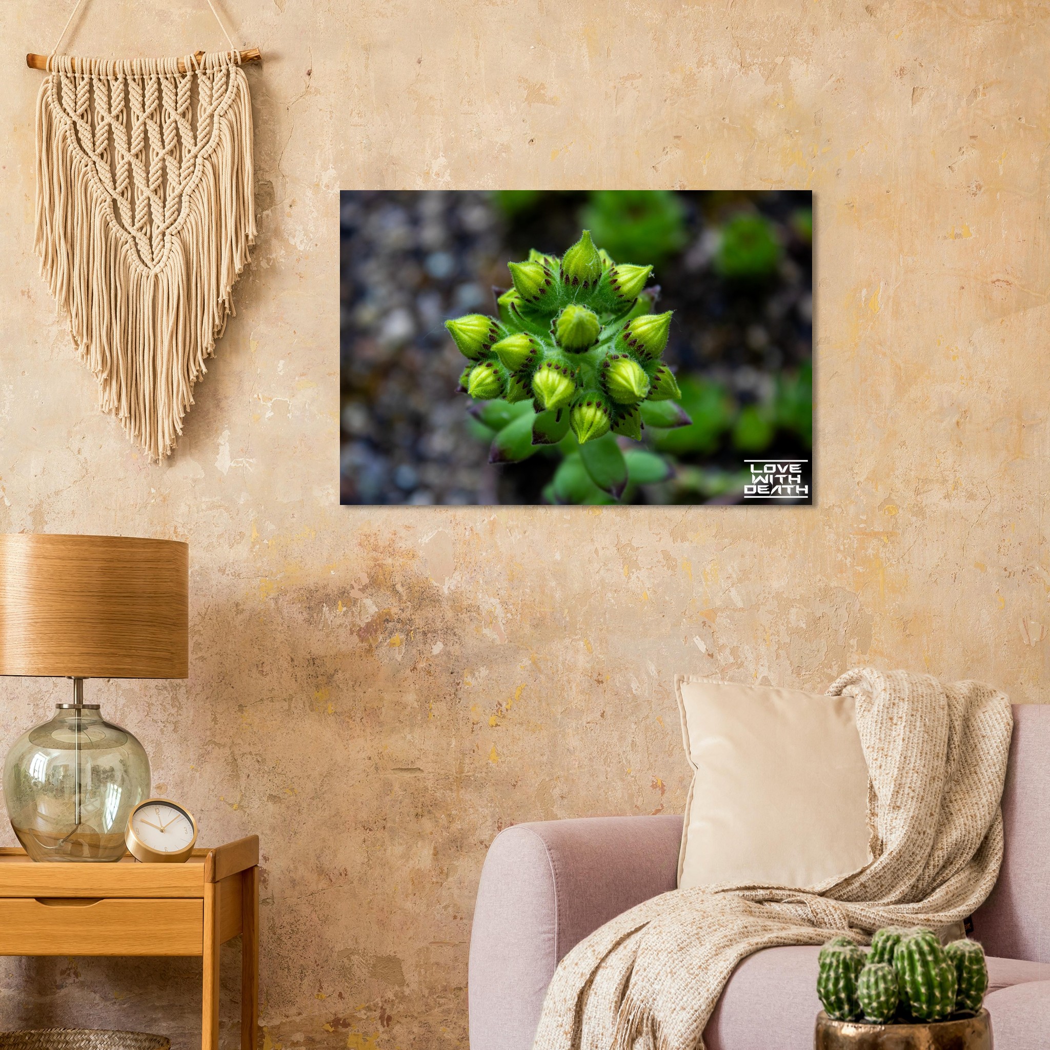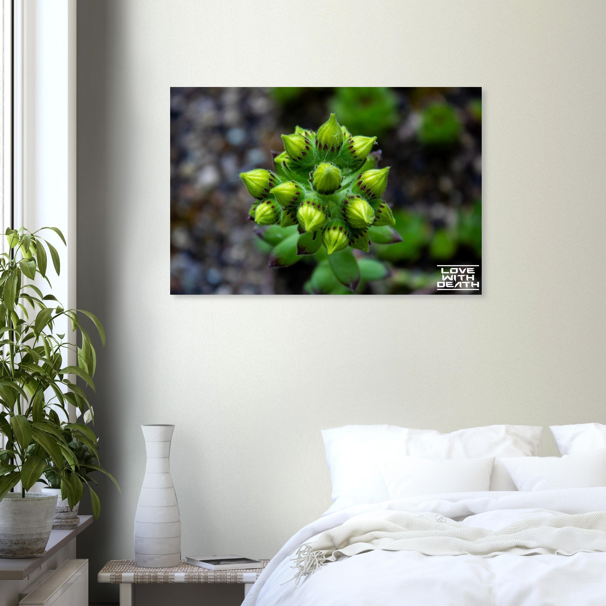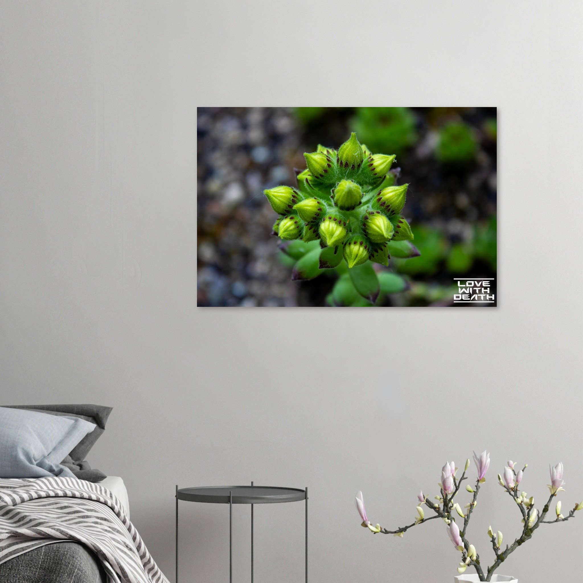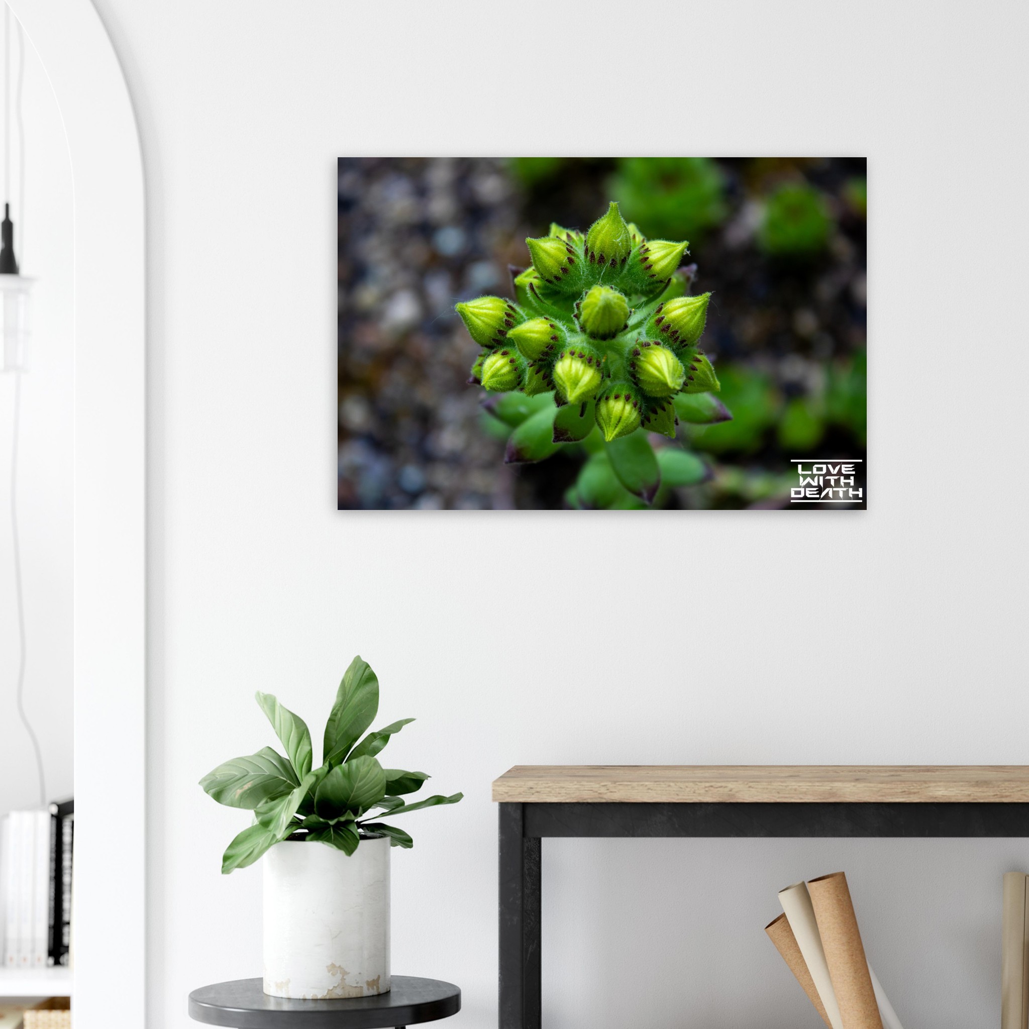 A close-up of succulent buds on the verge of blooming. The rich green tones of the buds, combined with delicate purple accents, stand out against the soft, earthy background. This image captures the magic and detail of nature in its early growth phase.