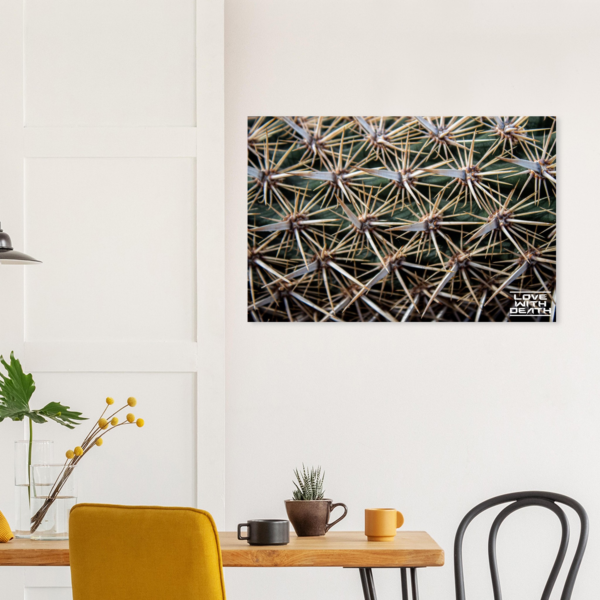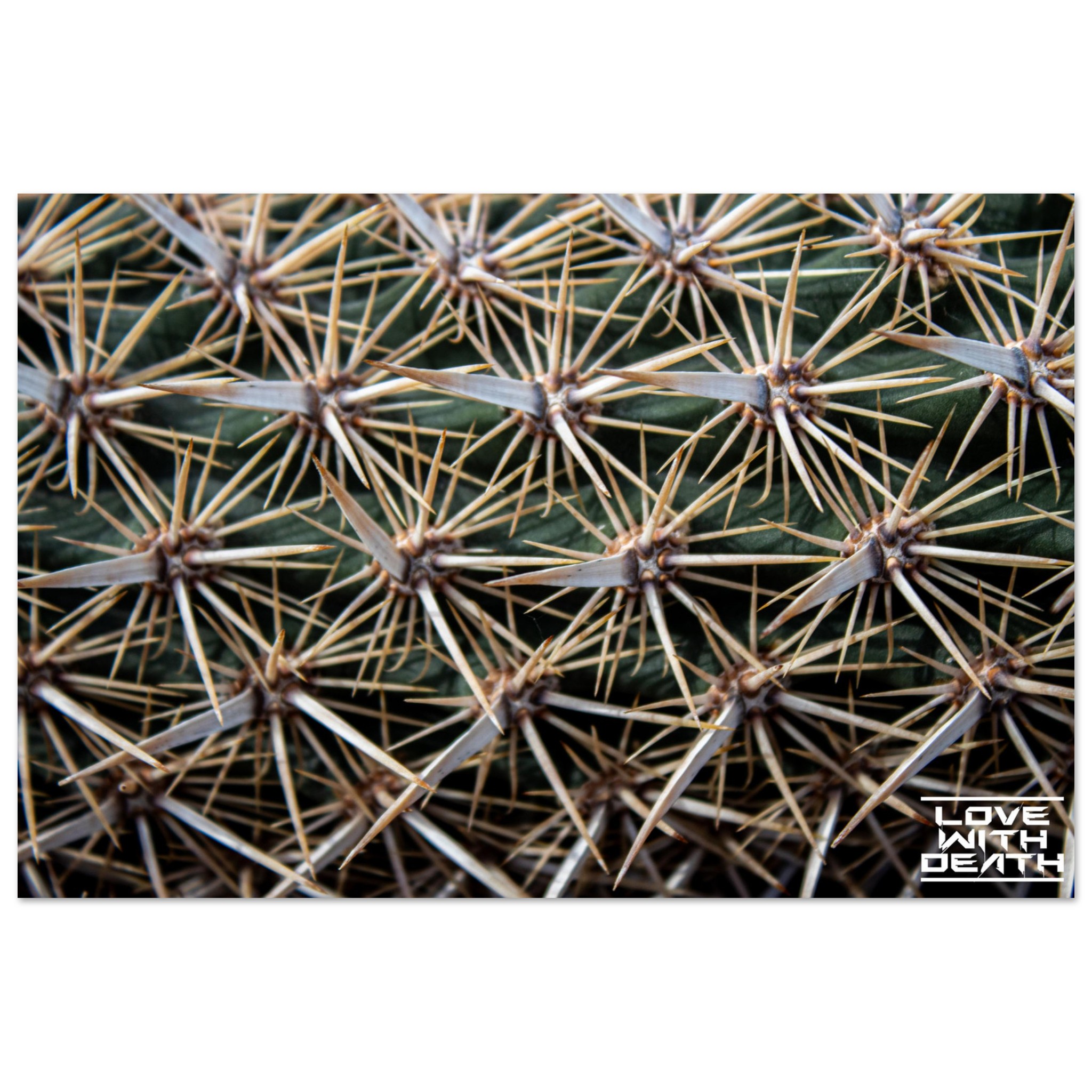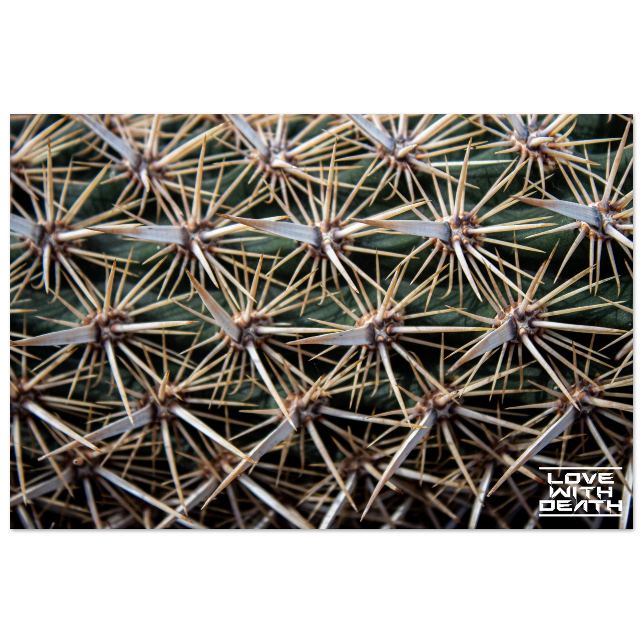 This macro shot of a cactus reveals the fascinating symmetry and structure of its spines. The contrasting colors of green and beige highlight the geometric patterns, giving the plant a unique aesthetic. The spines, resembling tiny sculptures, tell a story of adaptation and protection in nature.