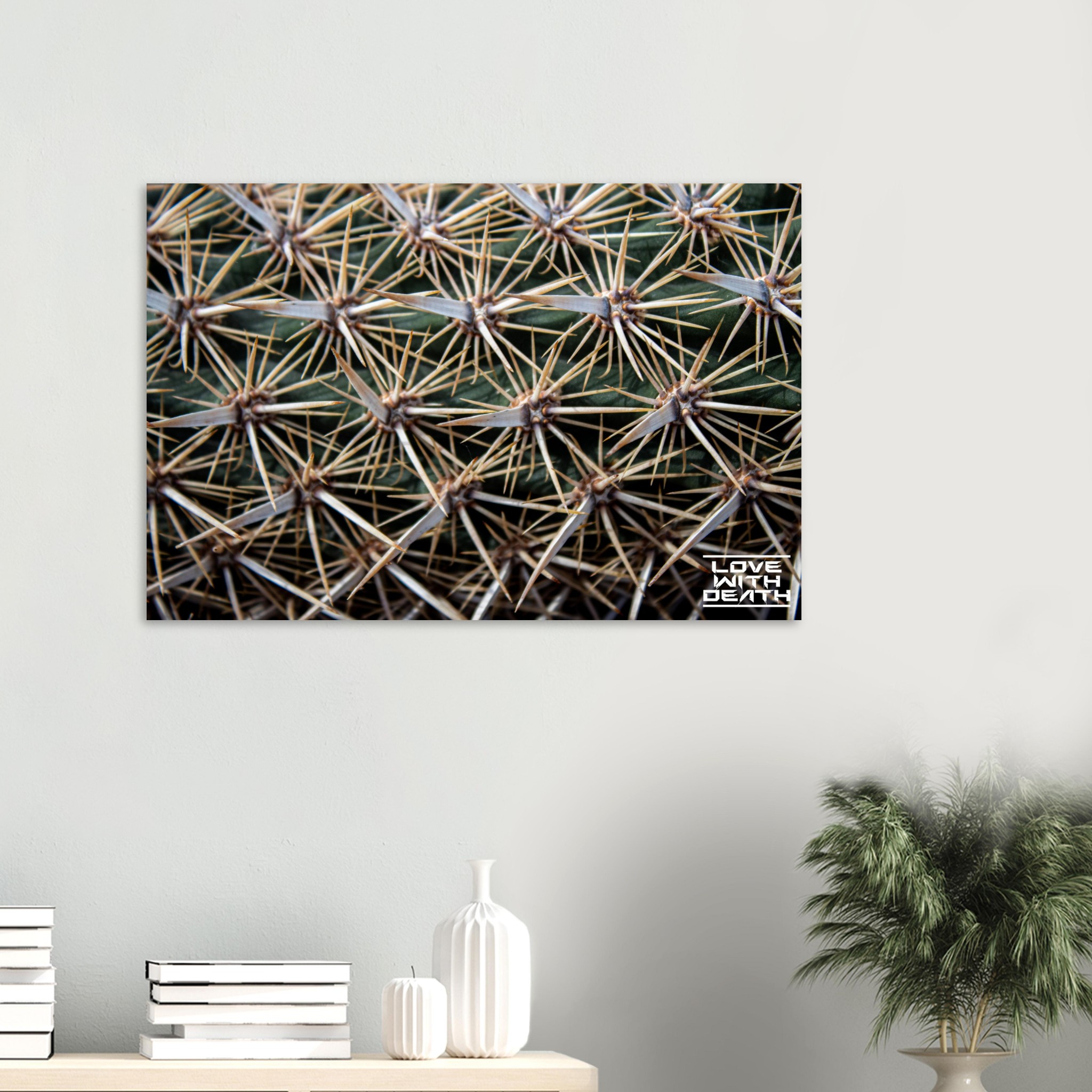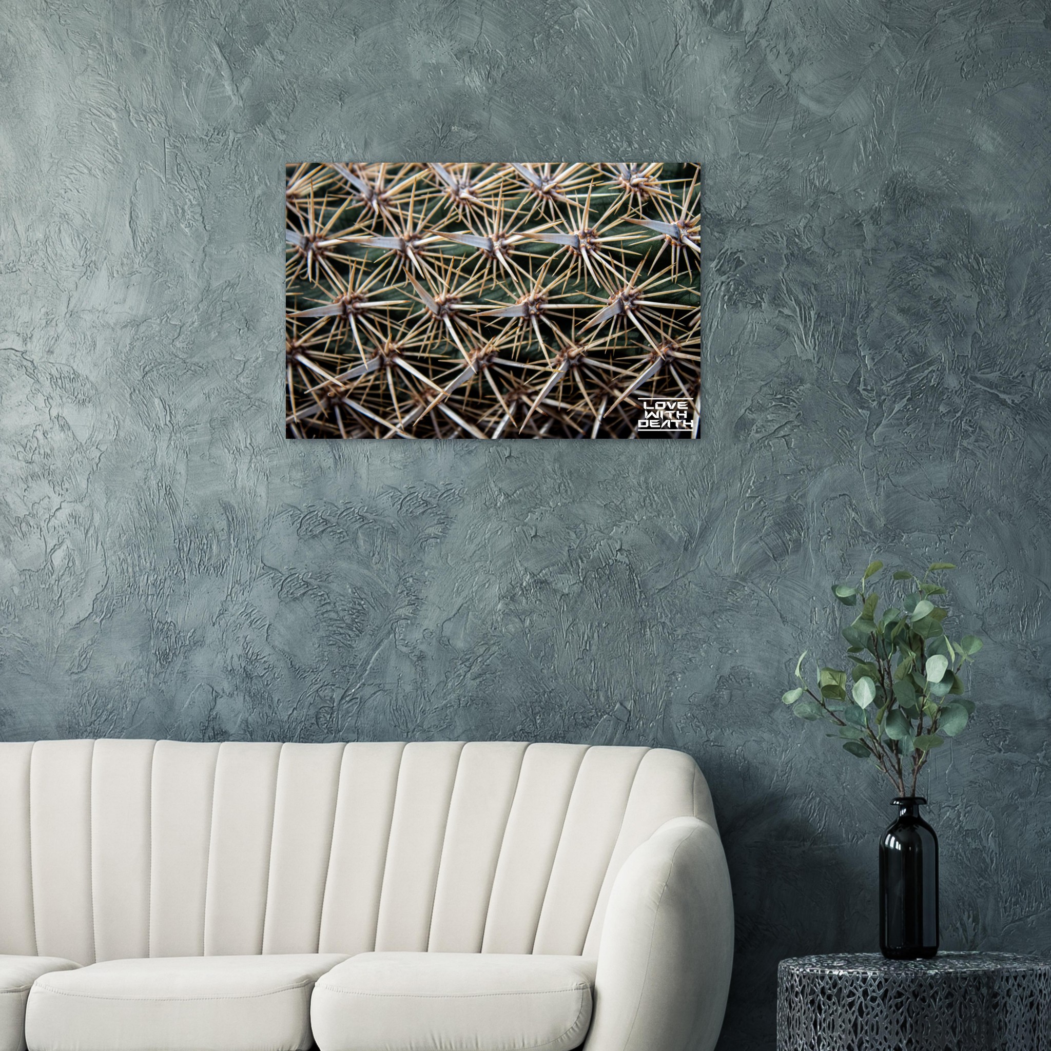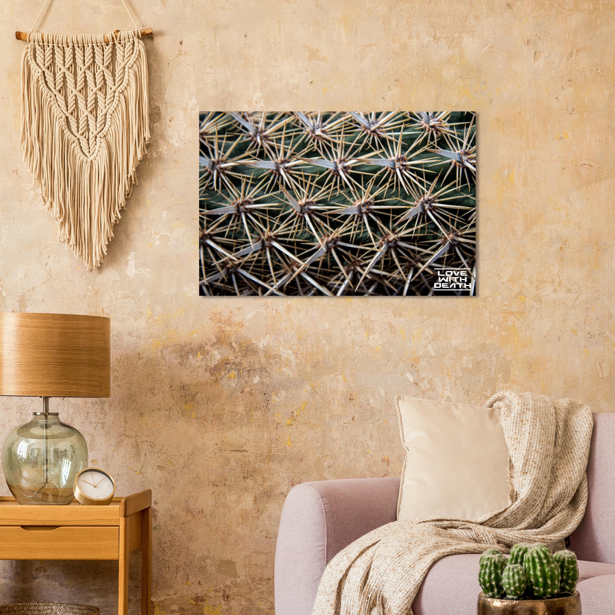 This macro shot of a cactus reveals the fascinating symmetry and structure of its spines. The contrasting colors of green and beige highlight the geometric patterns, giving the plant a unique aesthetic. The spines, resembling tiny sculptures, tell a story of adaptation and protection in nature.