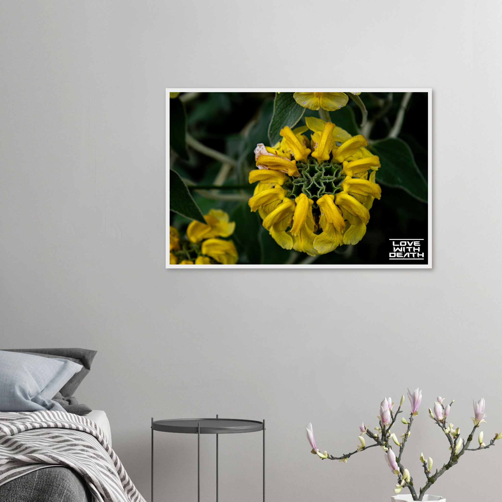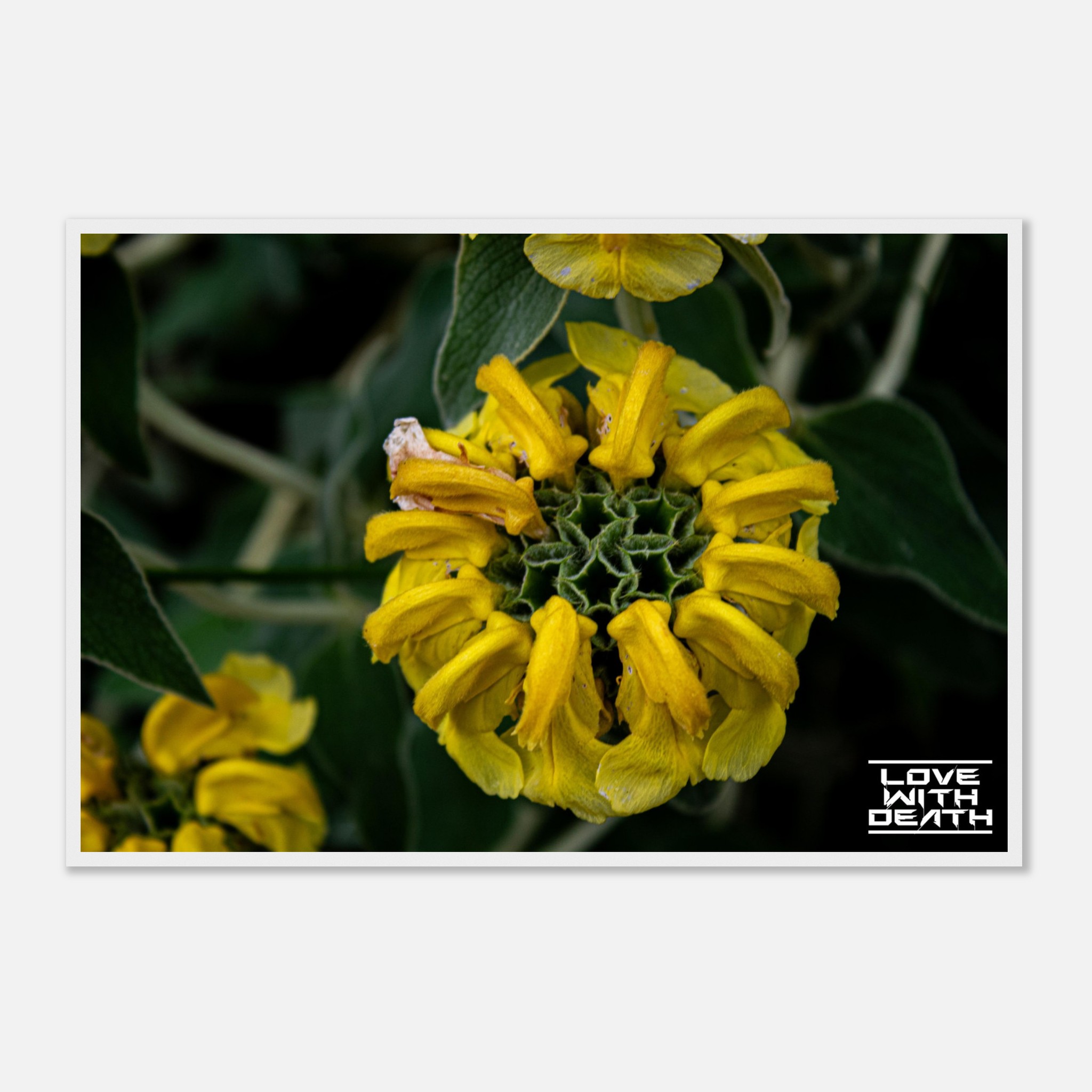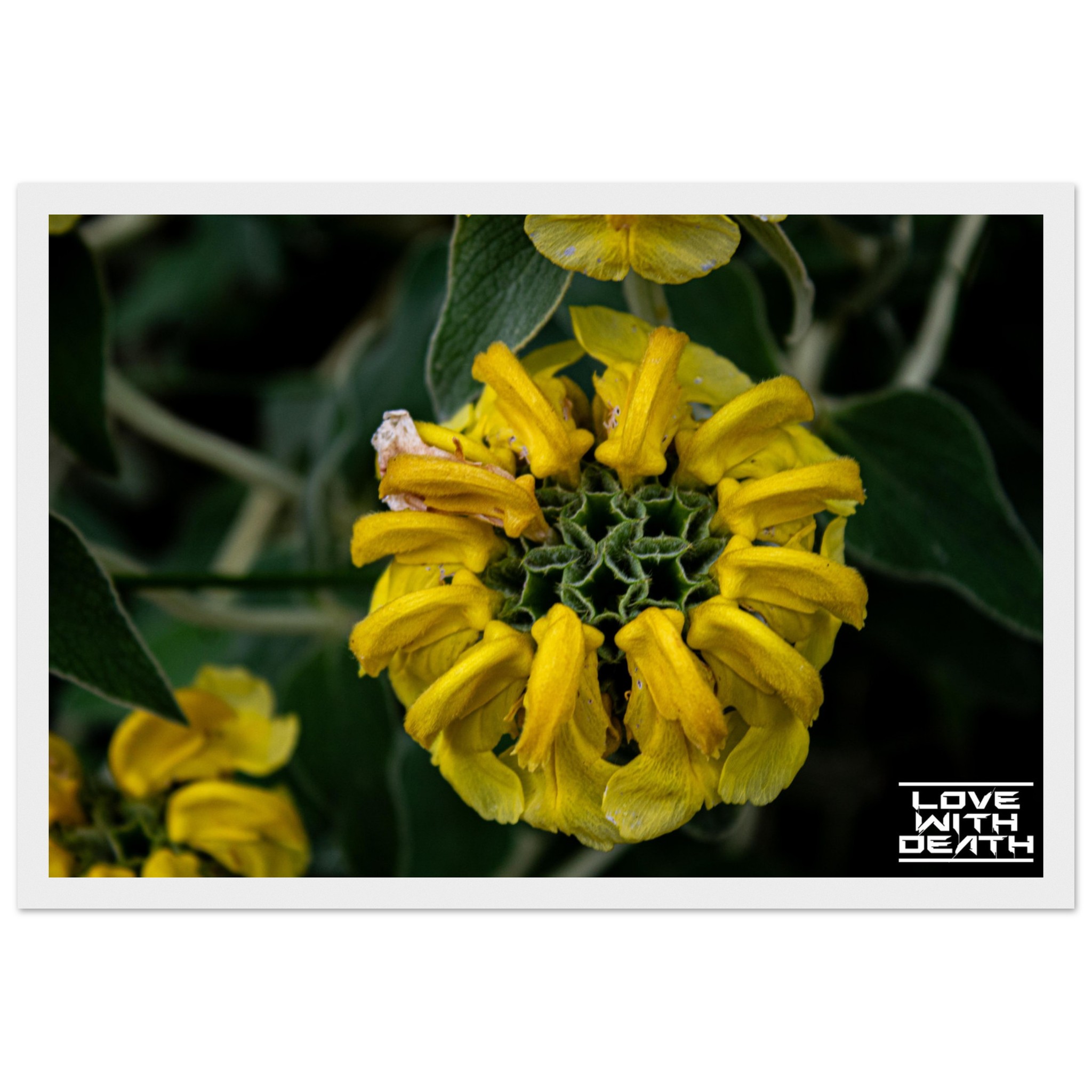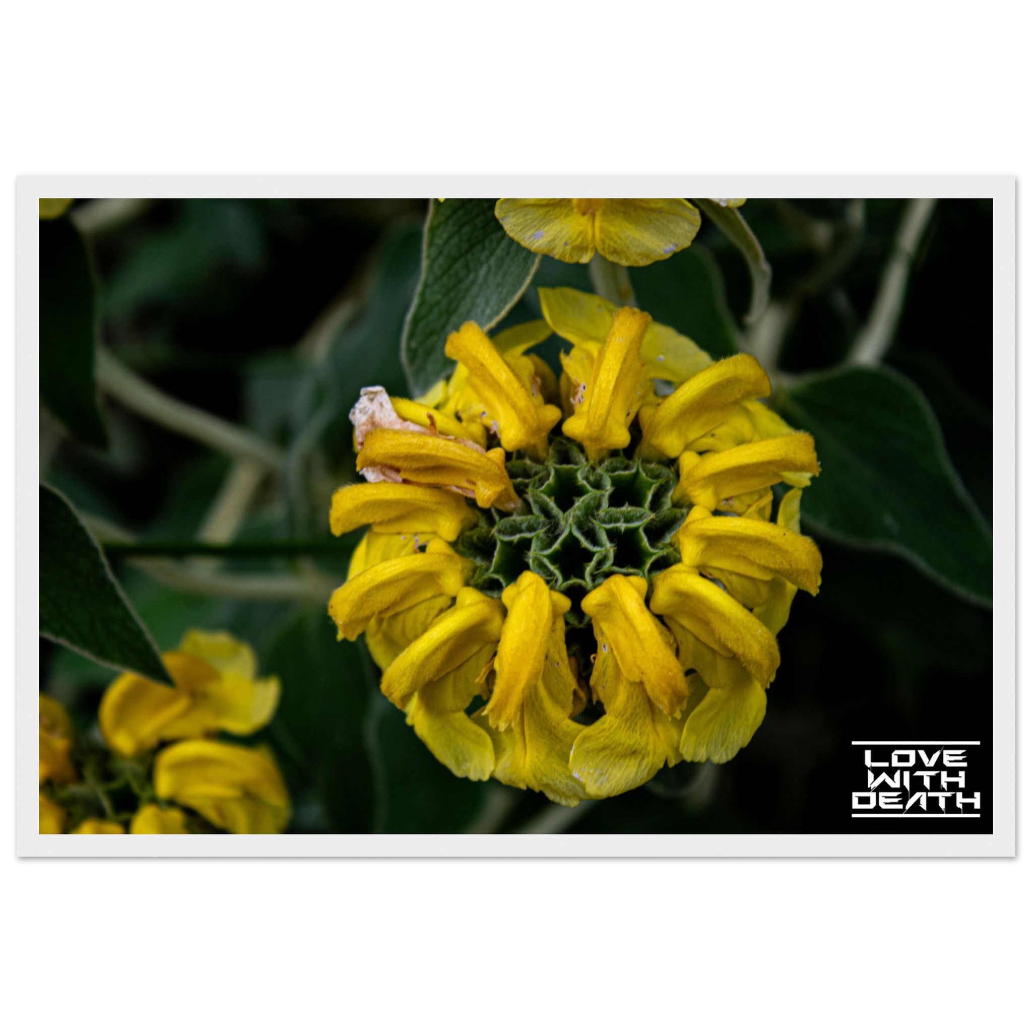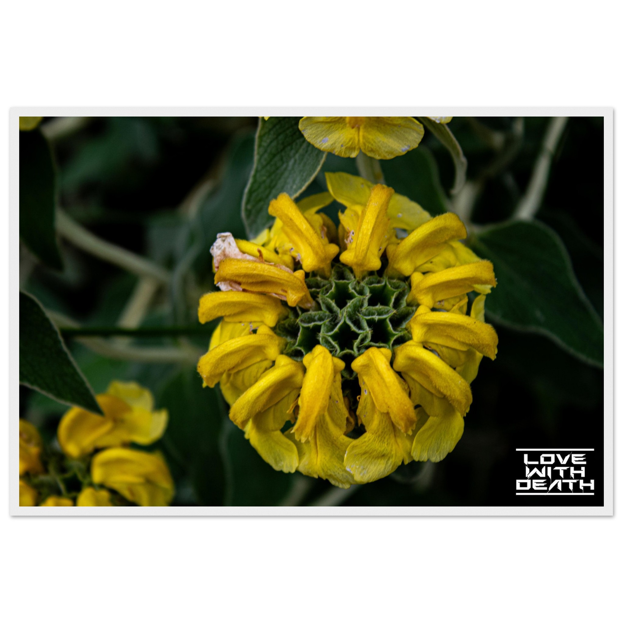 This close-up of a yellow flower showcases the intricate geometry of its petals arranged in a harmonious spiral around the center. Subtle imperfections and the yellow hues add an authentic, natural charm. The blurred green background highlights the flower’s vibrant colors, evoking a sense of vitality.