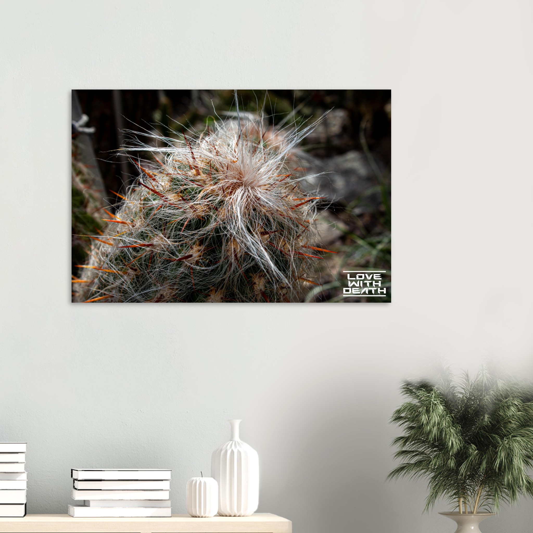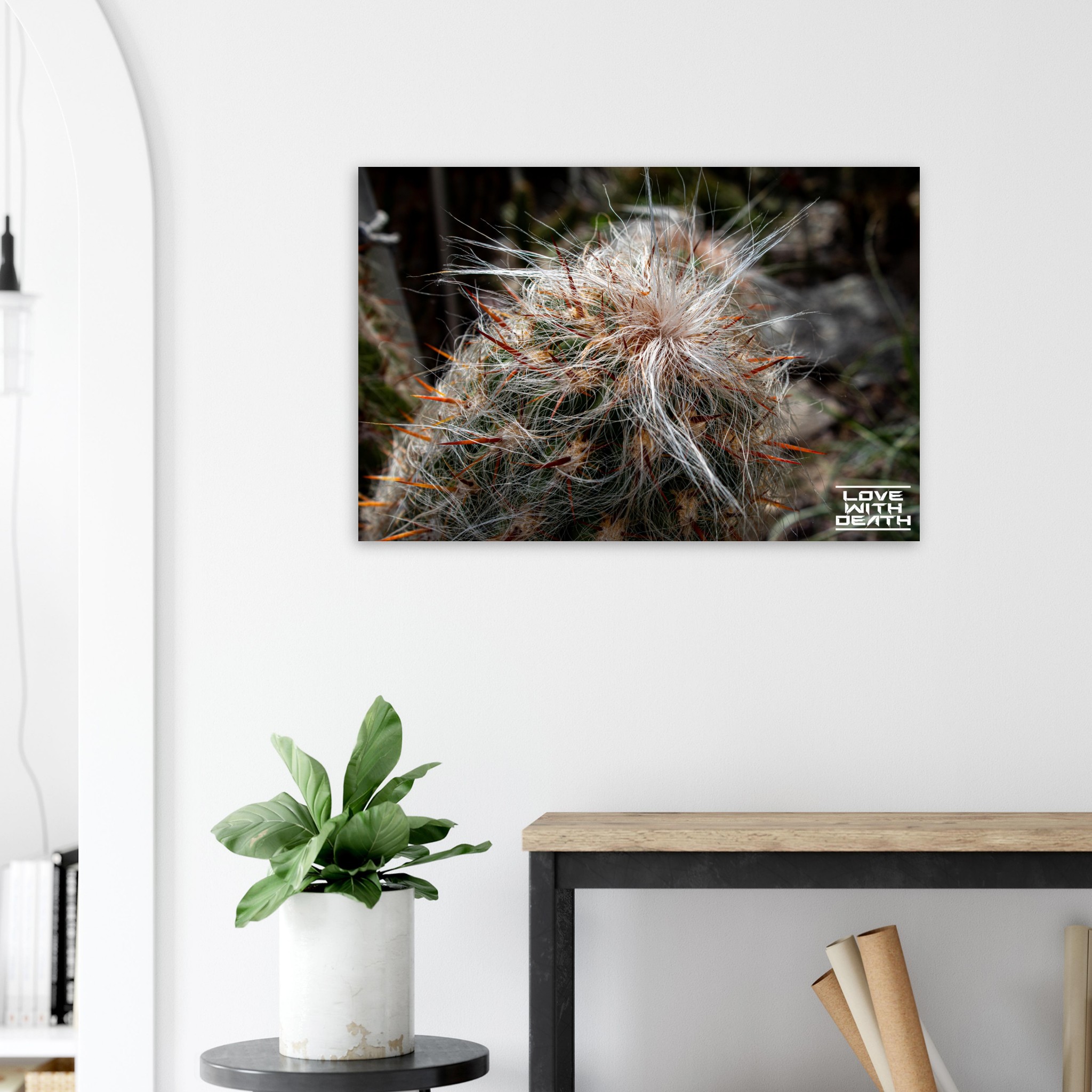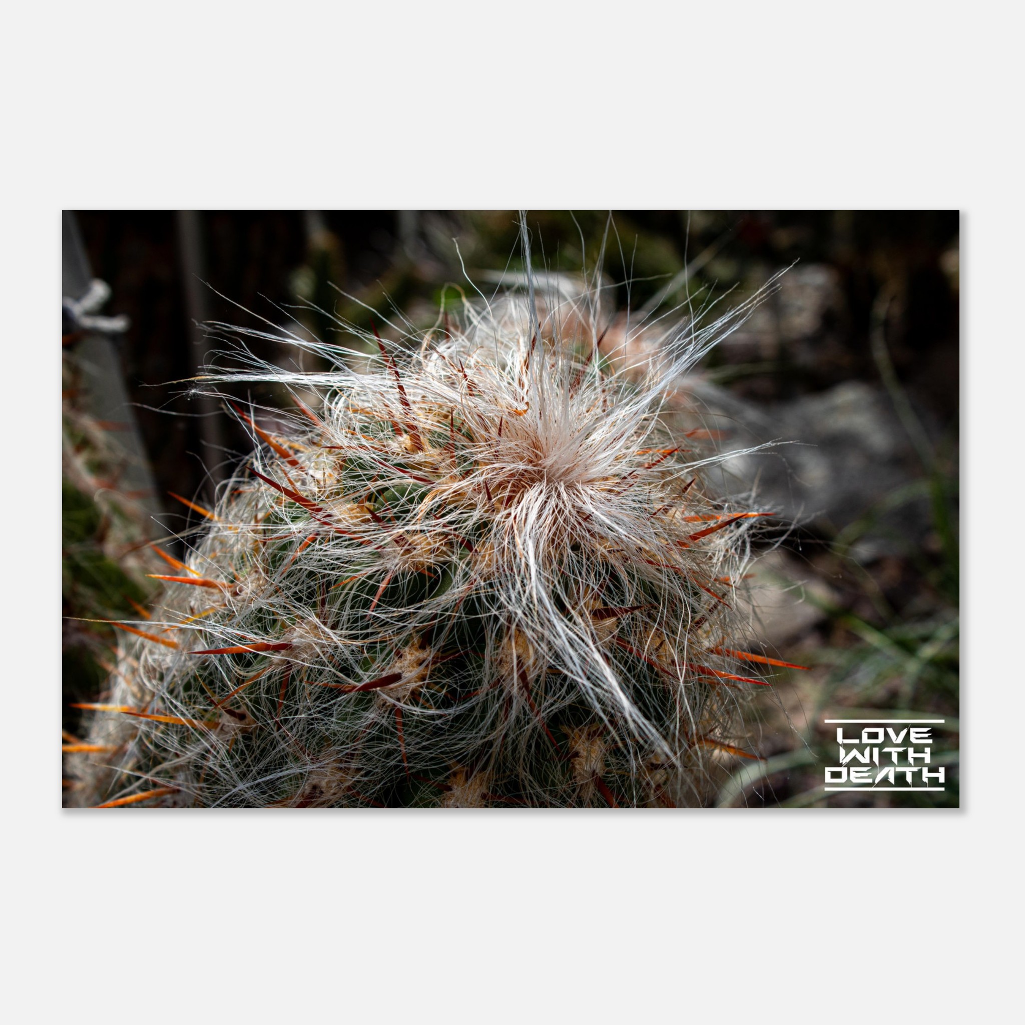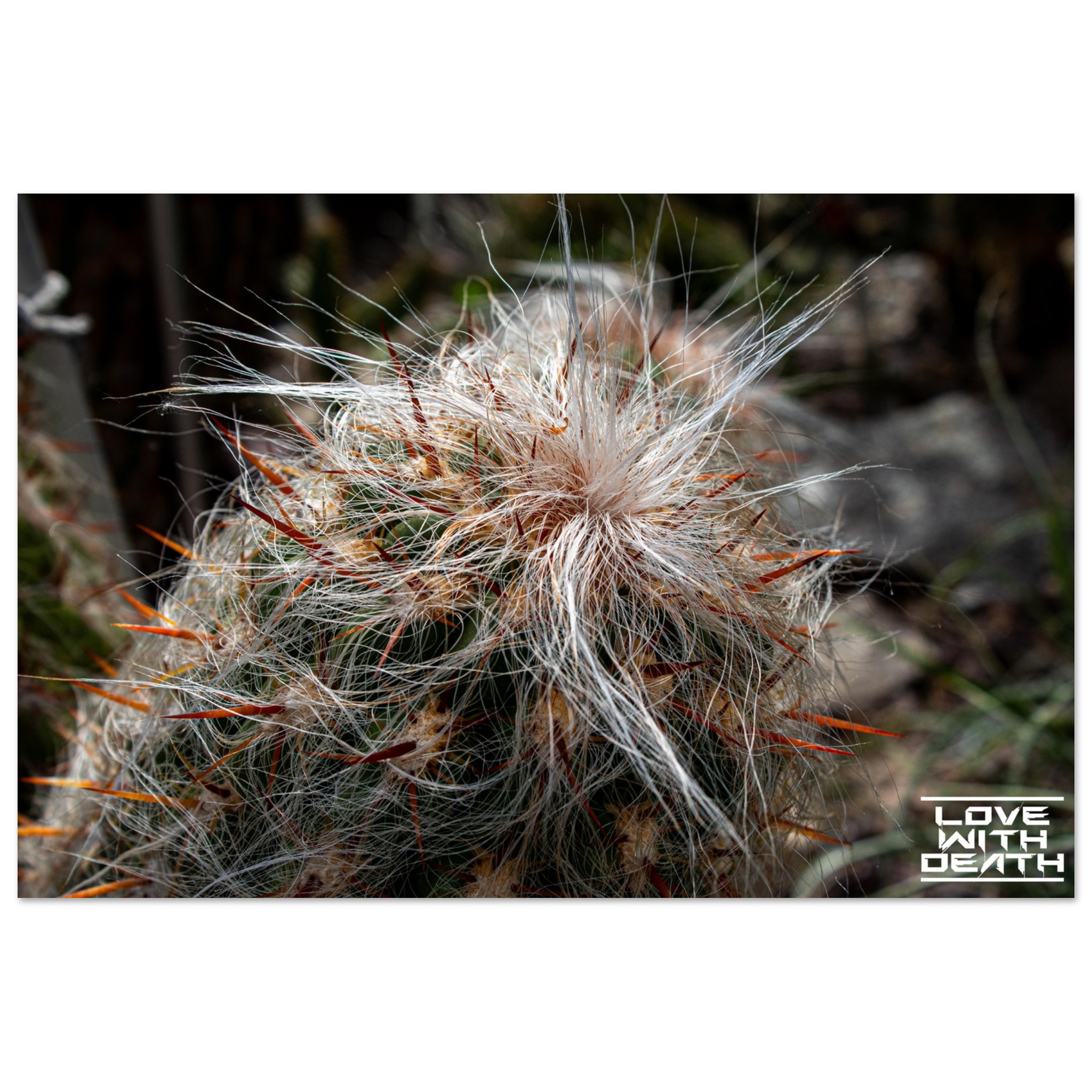 An extraordinary cactus featuring a white, hair-like covering paired with fiery red spines, creating a striking image of contrasts. The soft textures surprisingly blend with the sharp, rigid elements, showcasing nature’s fascinating diversity.
