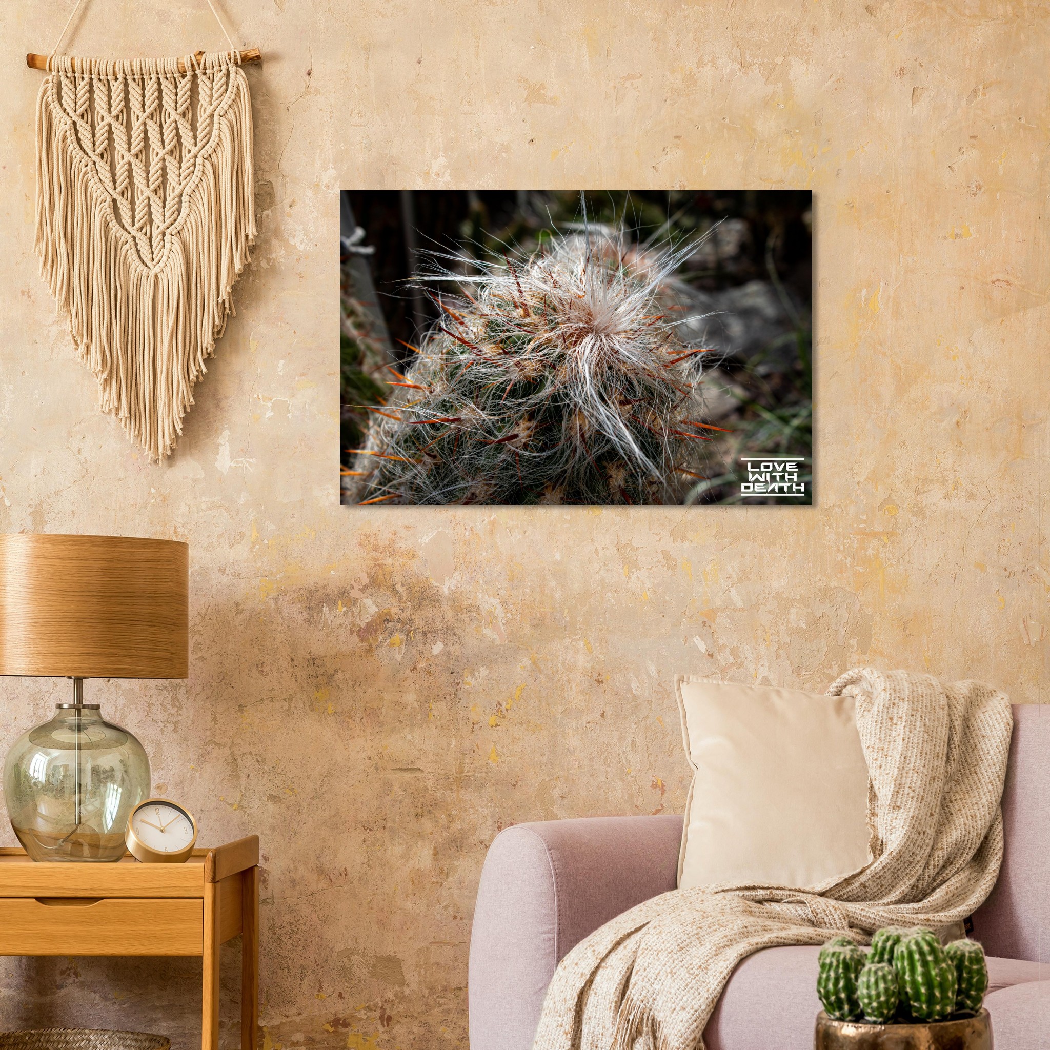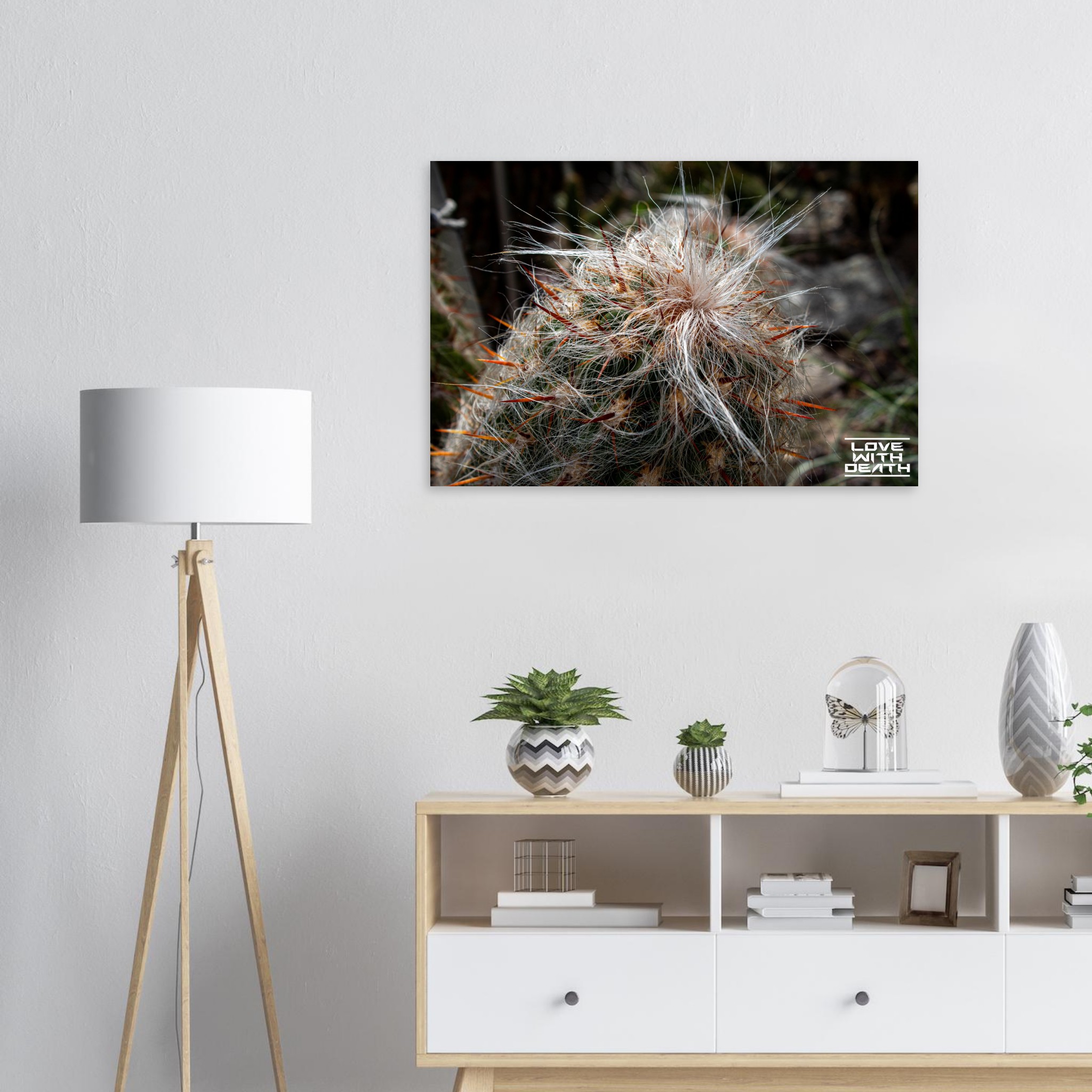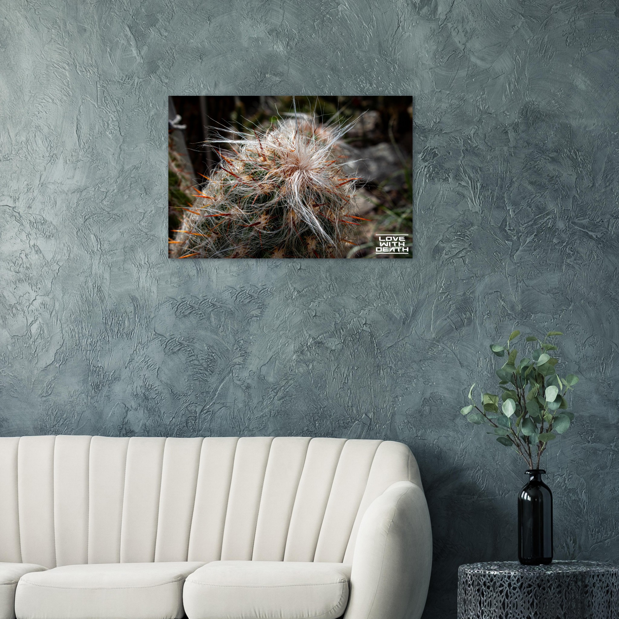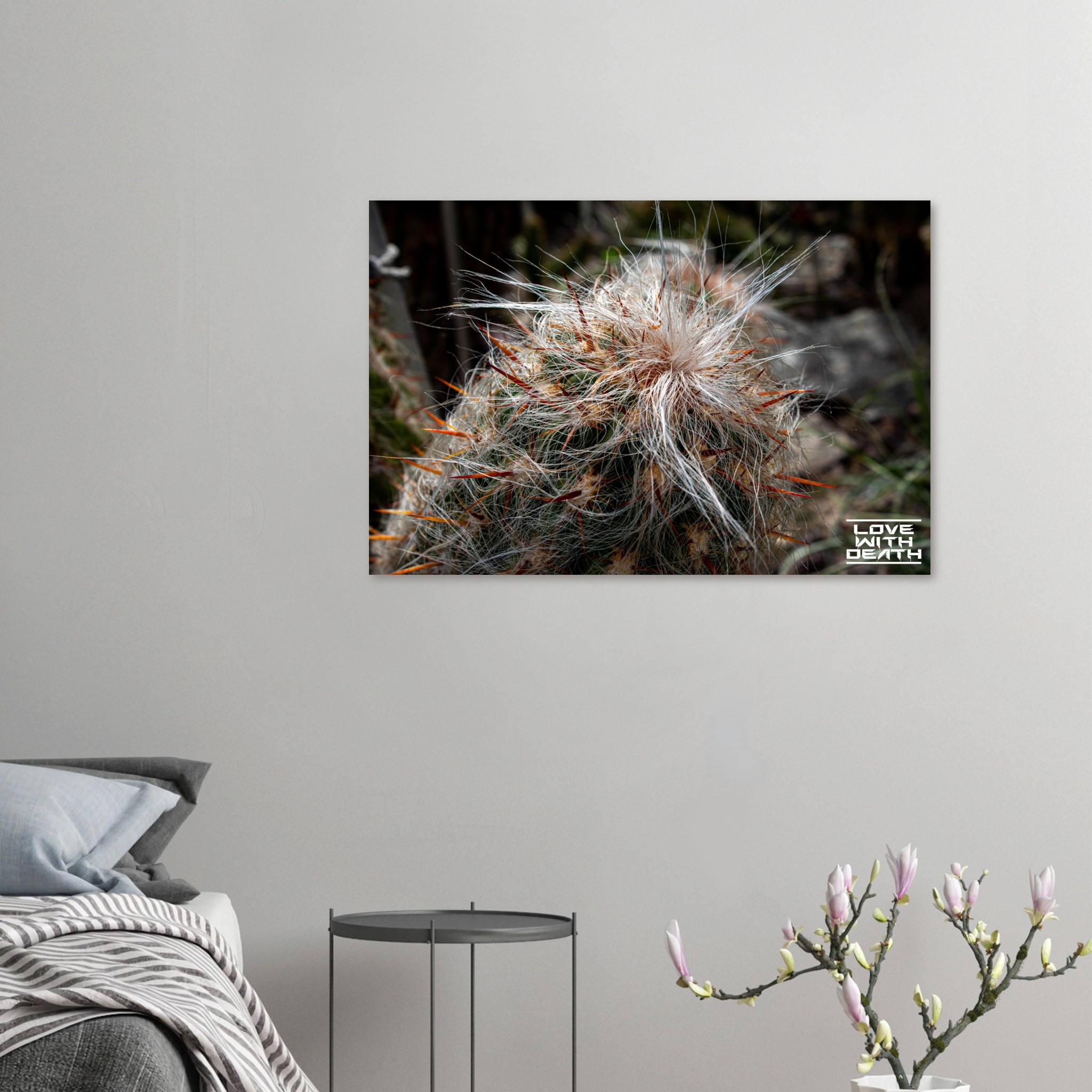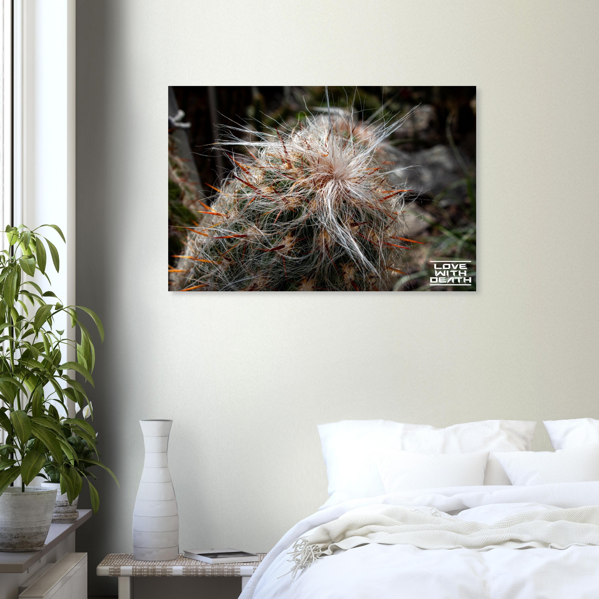 An extraordinary cactus featuring a white, hair-like covering paired with fiery red spines, creating a striking image of contrasts. The soft textures surprisingly blend with the sharp, rigid elements, showcasing nature’s fascinating diversity.