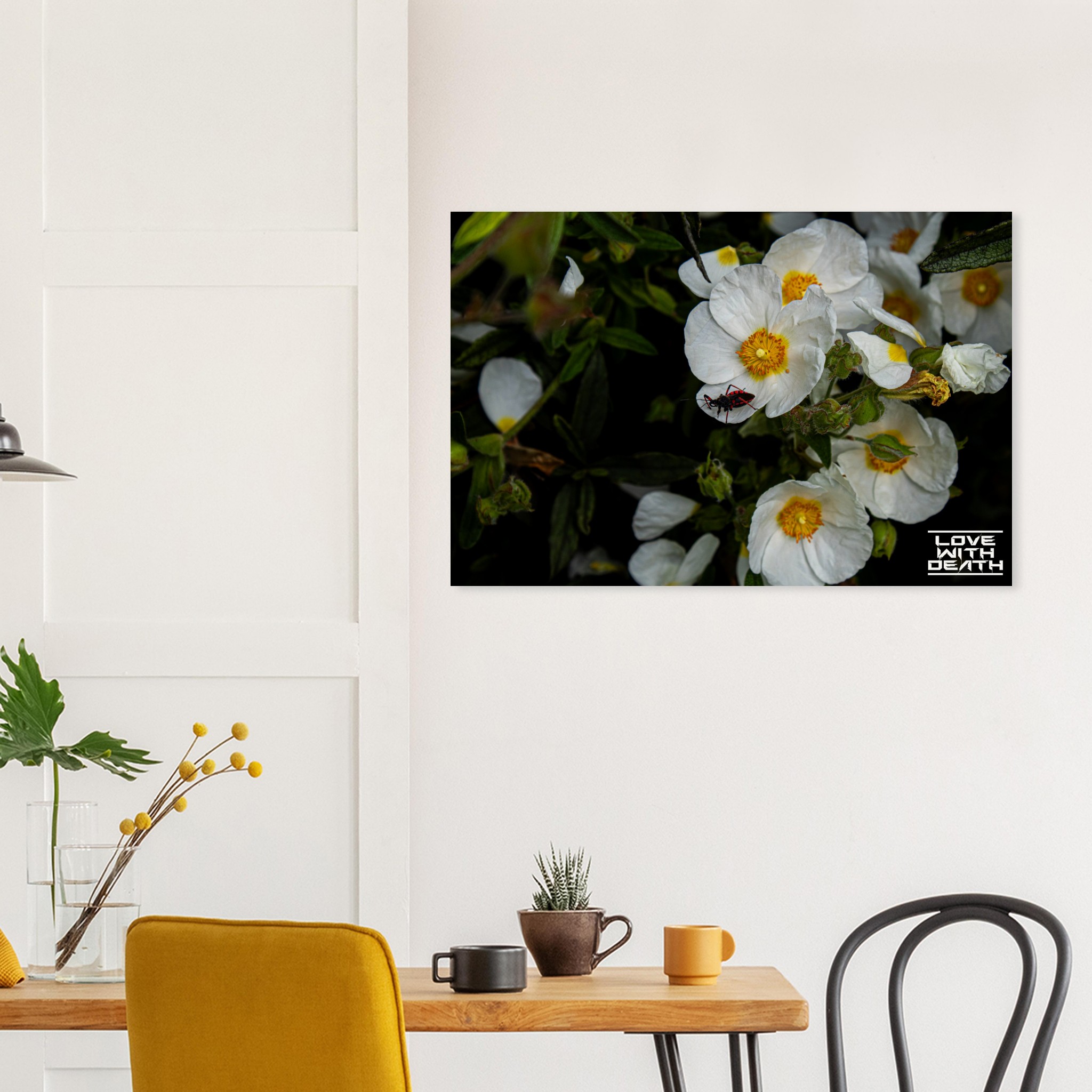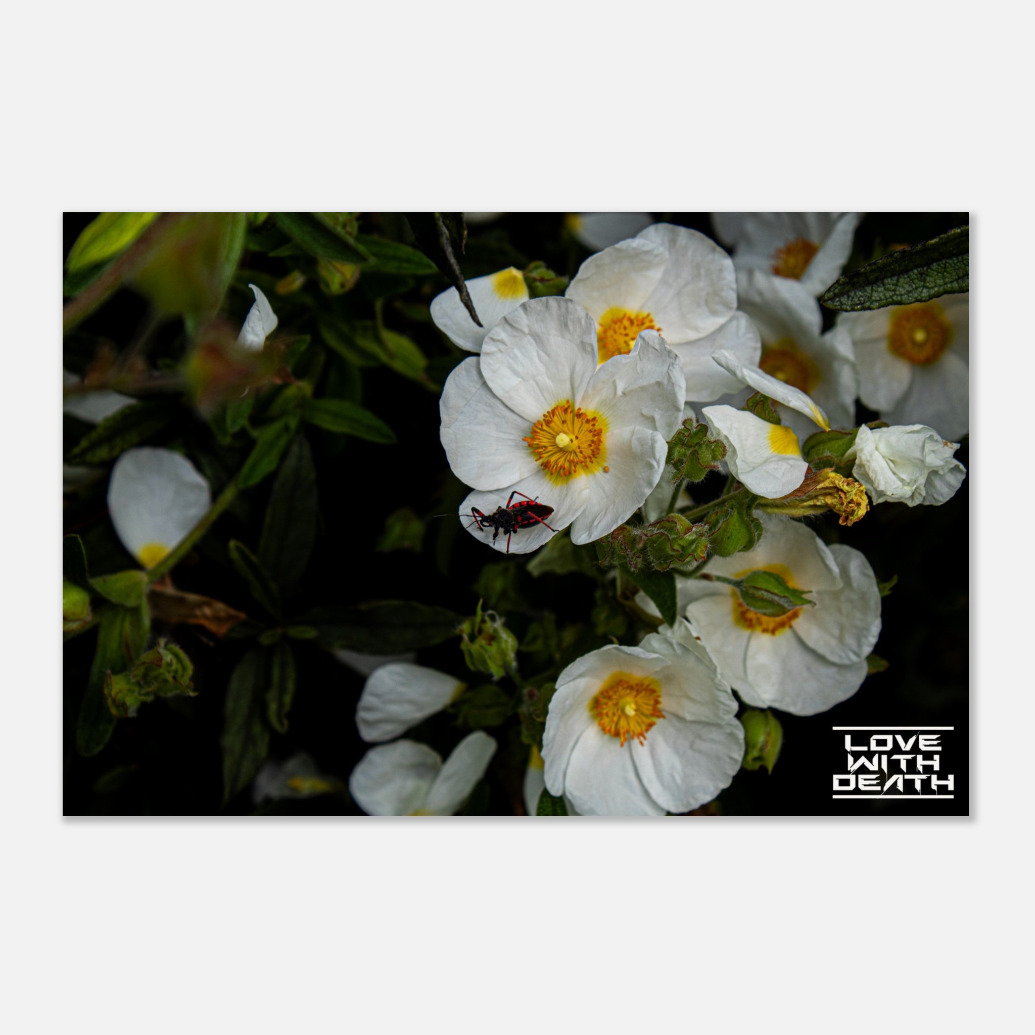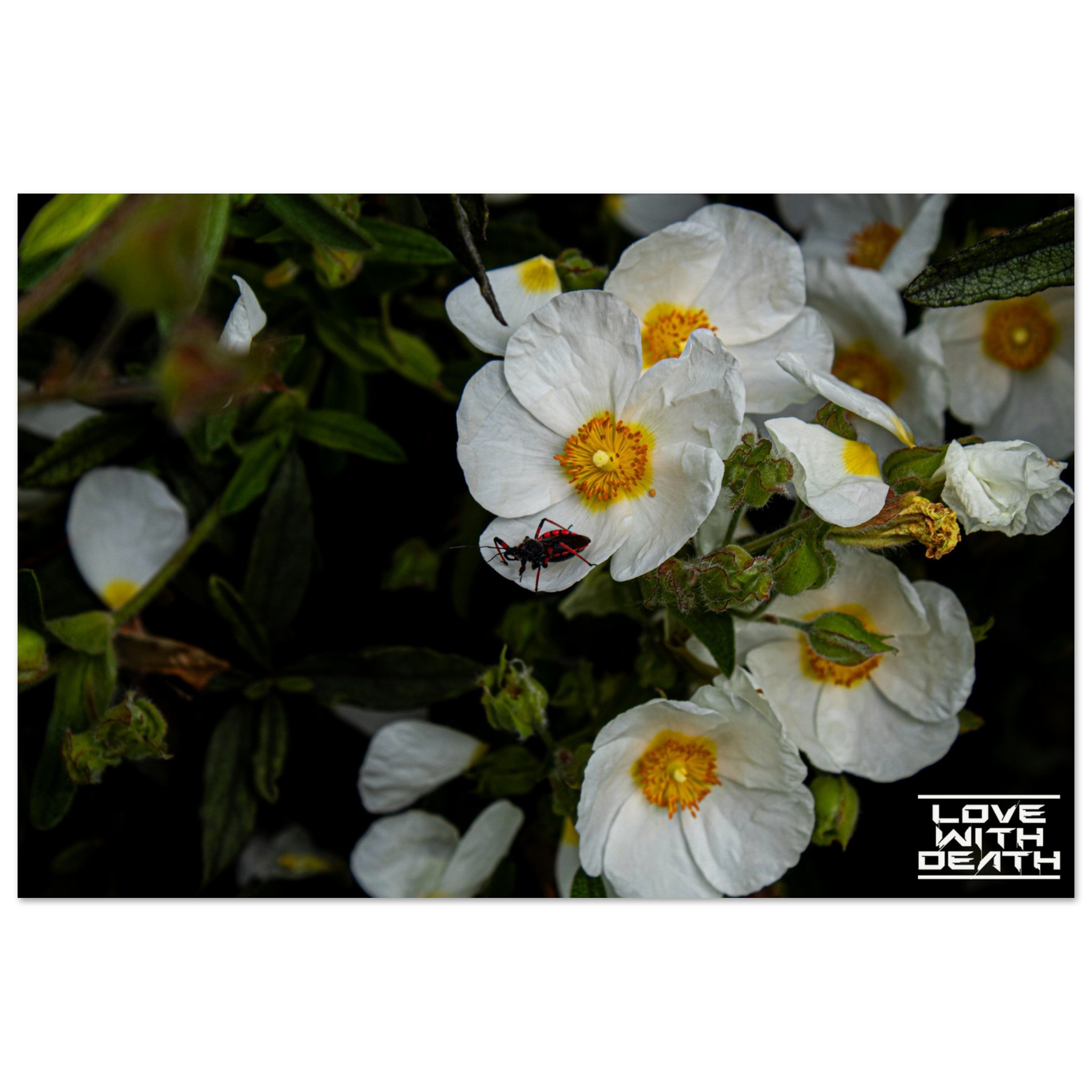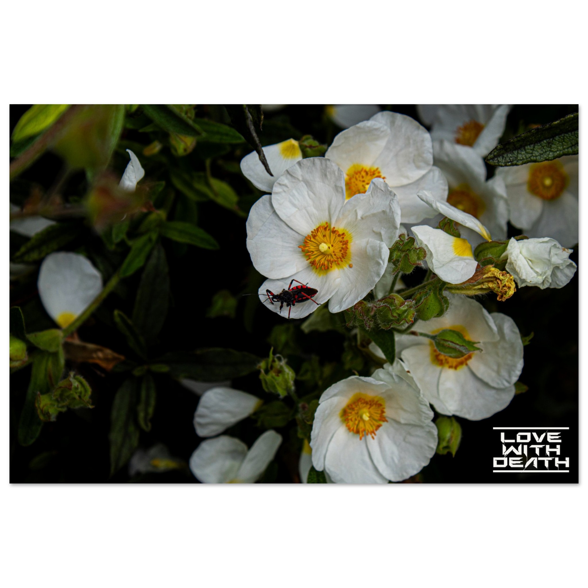 This close-up captures the beauty of a white blossom visited by a striking red and black insect. The bright flower, with its sunny yellow center, creates a captivating contrast to the insect’s dark tones and the green surroundings.
