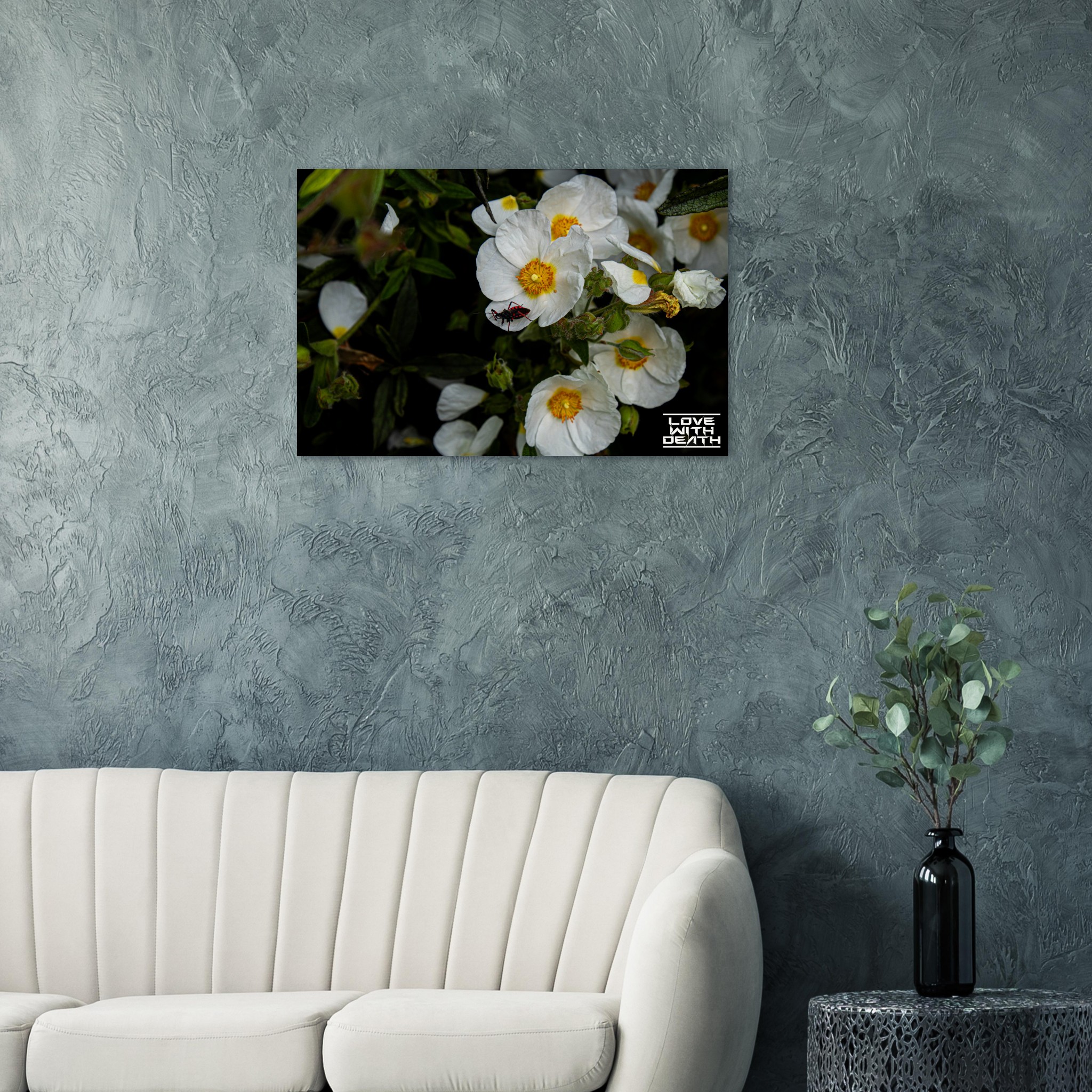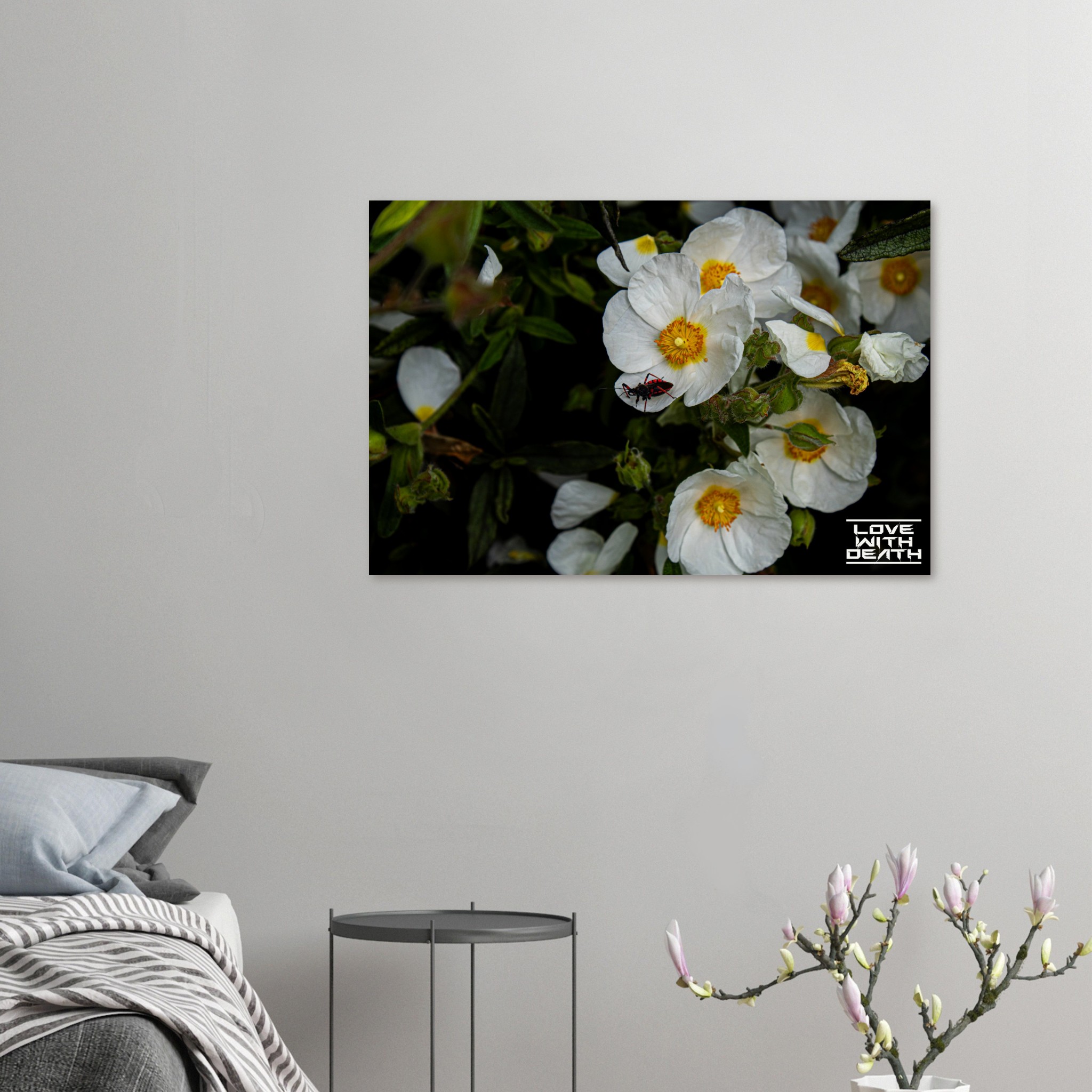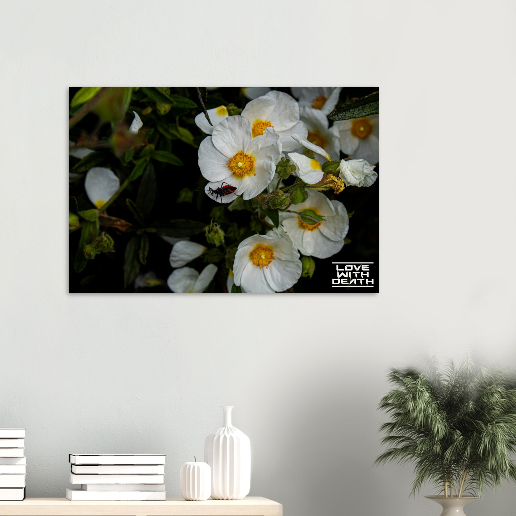 This close-up captures the beauty of a white blossom visited by a striking red and black insect. The bright flower, with its sunny yellow center, creates a captivating contrast to the insect’s dark tones and the green surroundings.