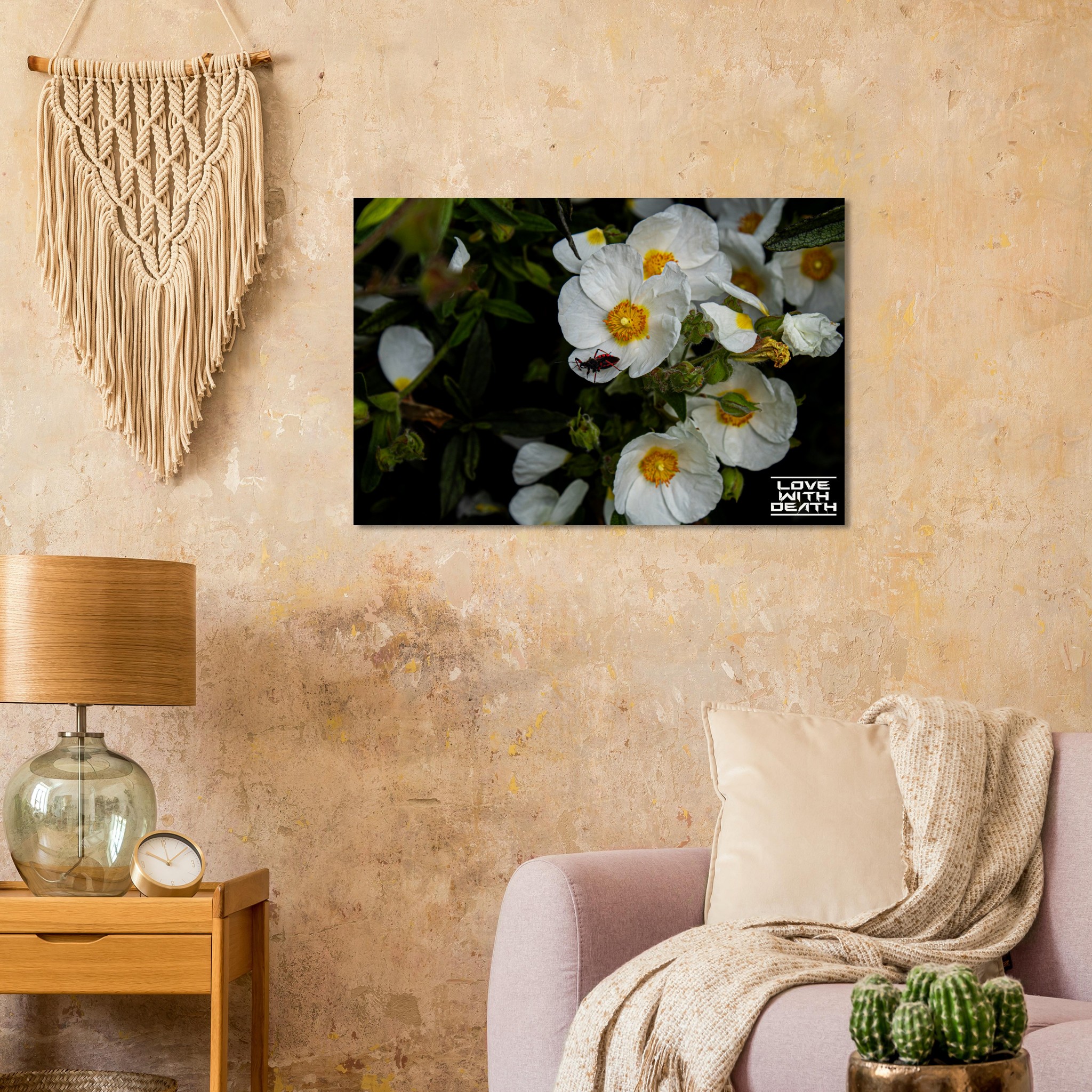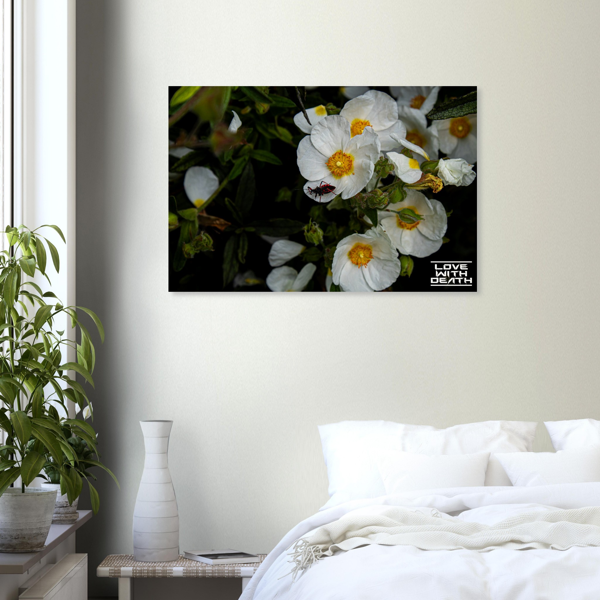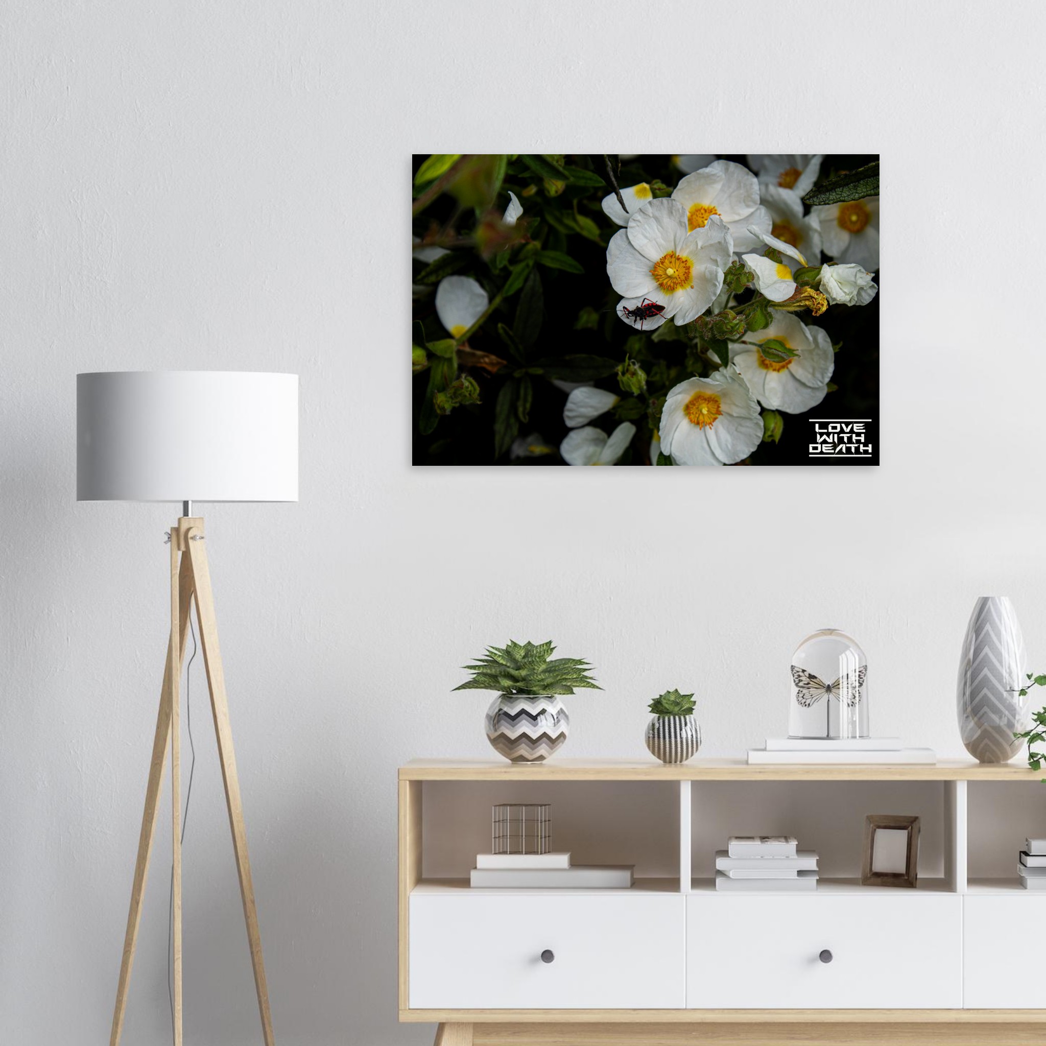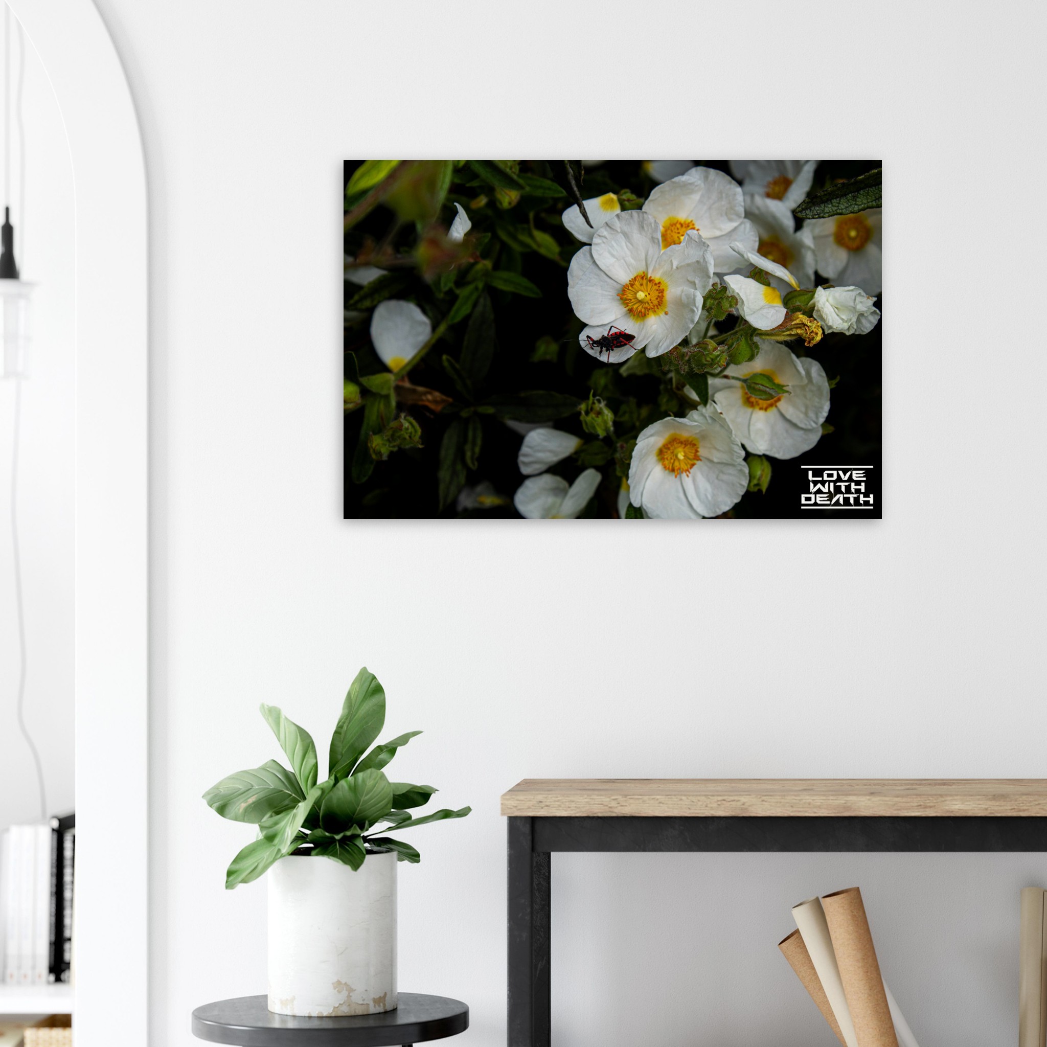 This close-up captures the beauty of a white blossom visited by a striking red and black insect. The bright flower, with its sunny yellow center, creates a captivating contrast to the insect’s dark tones and the green surroundings.