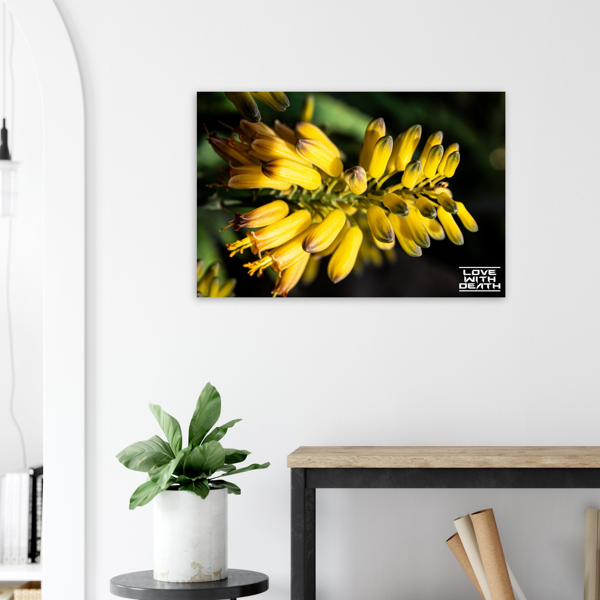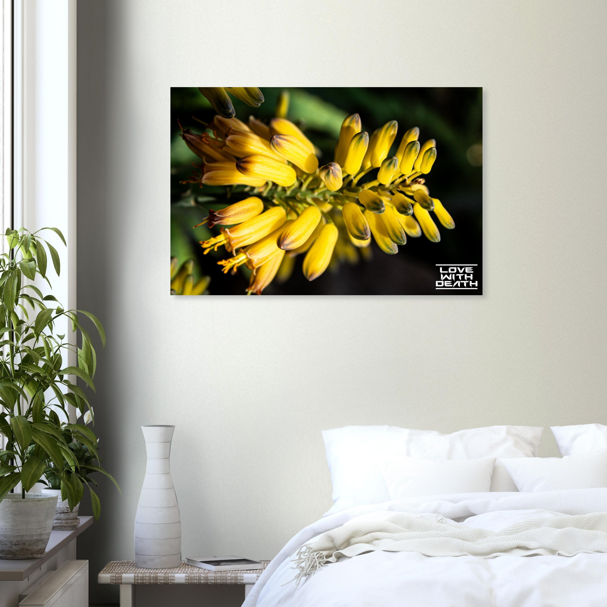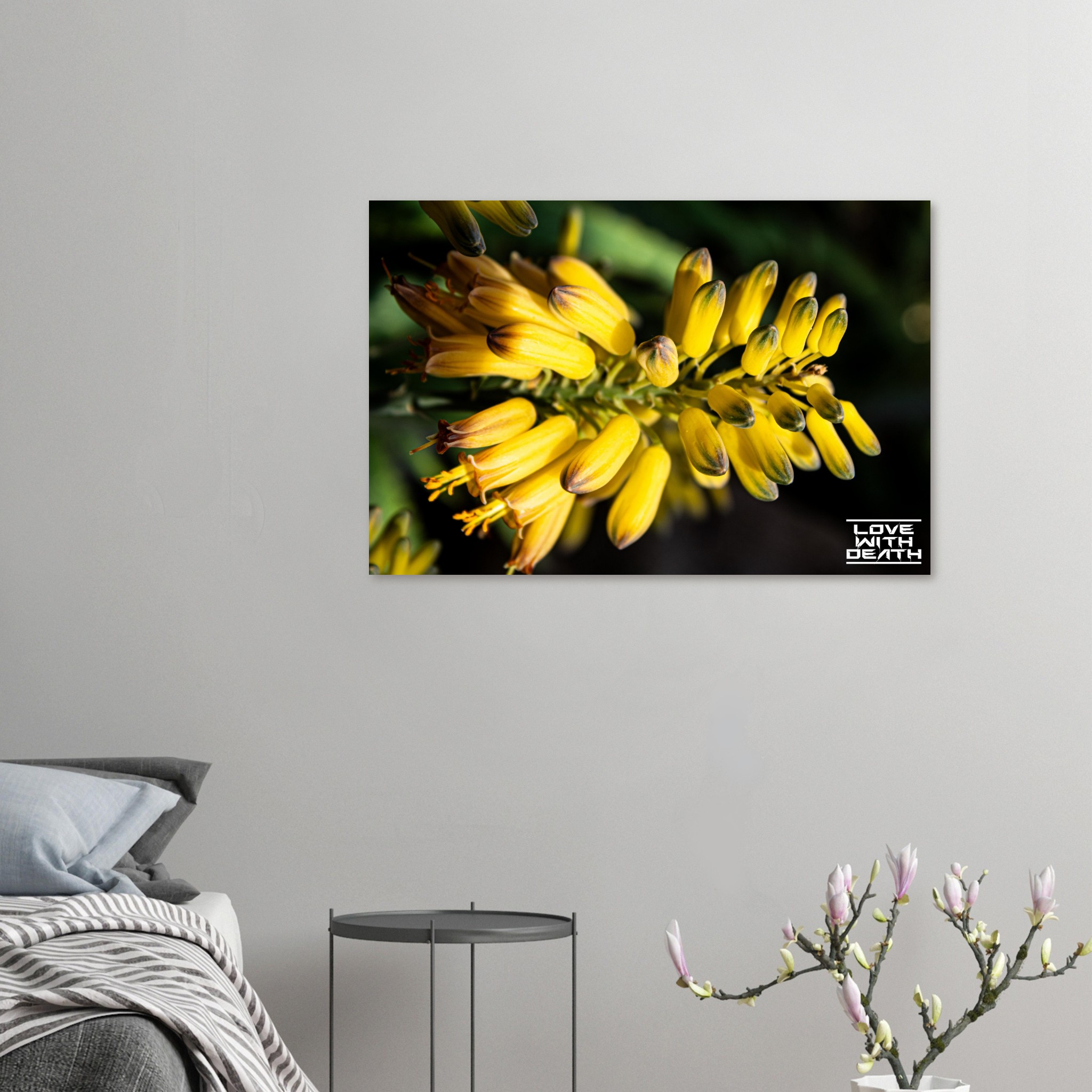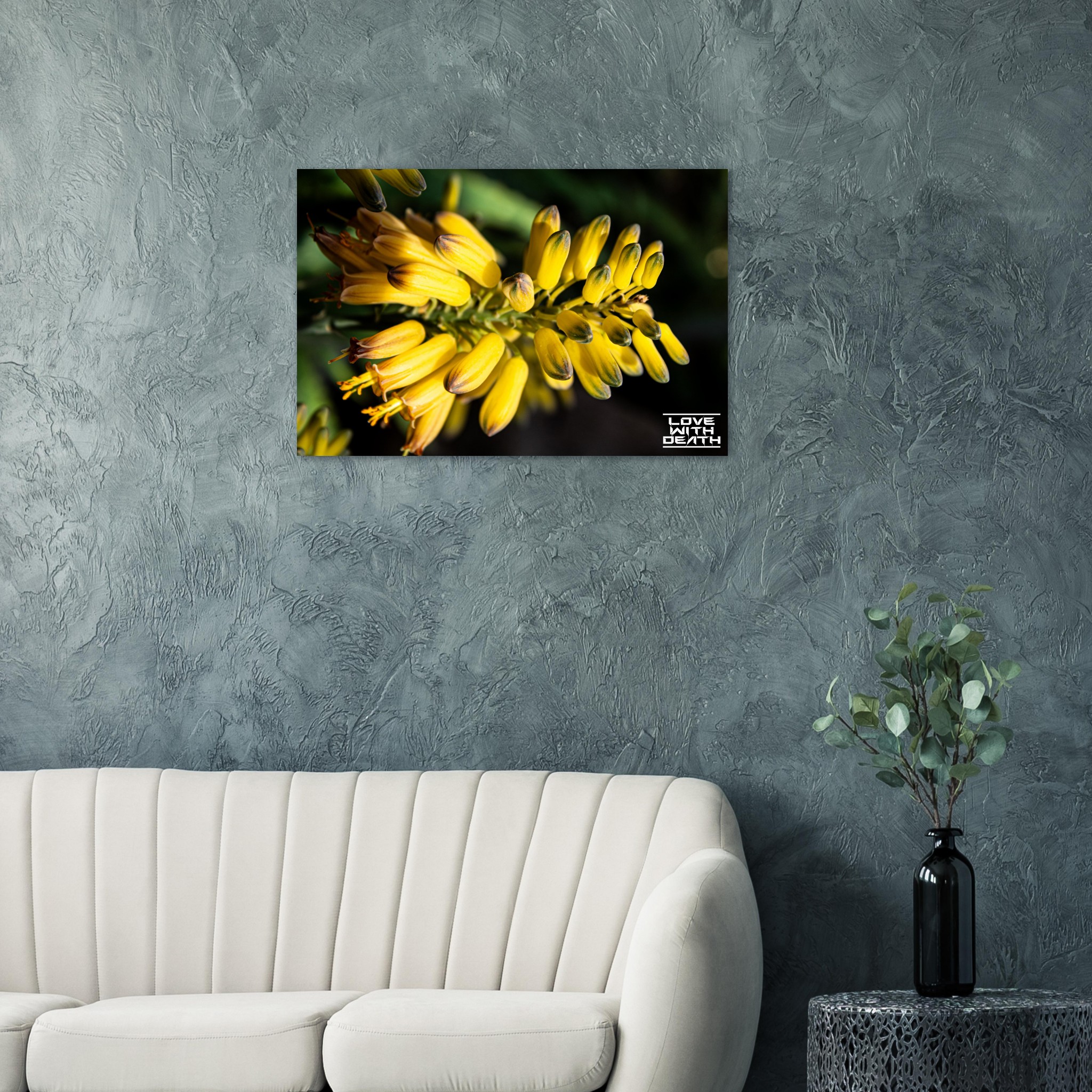 A macro photograph capturing the delicate elegance and vibrant colors of a yellow flower bud. The vivid yellow blooms gently curve towards openness, showcasing impressive color gradients that transition from soft green to a warm golden hue.