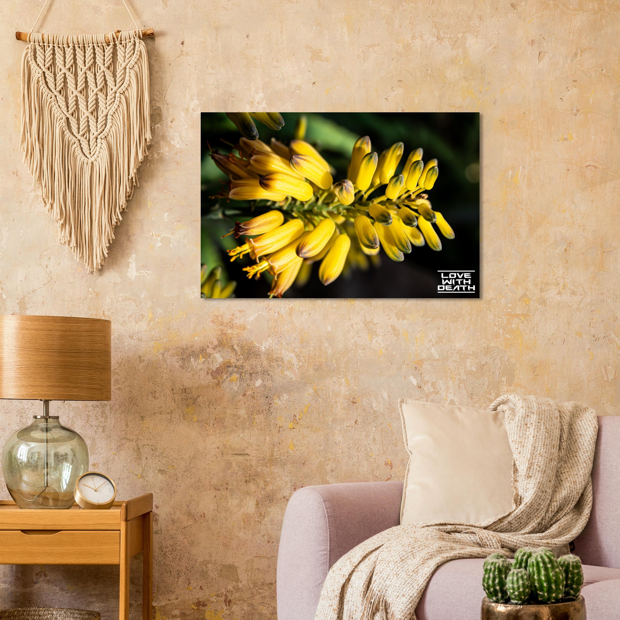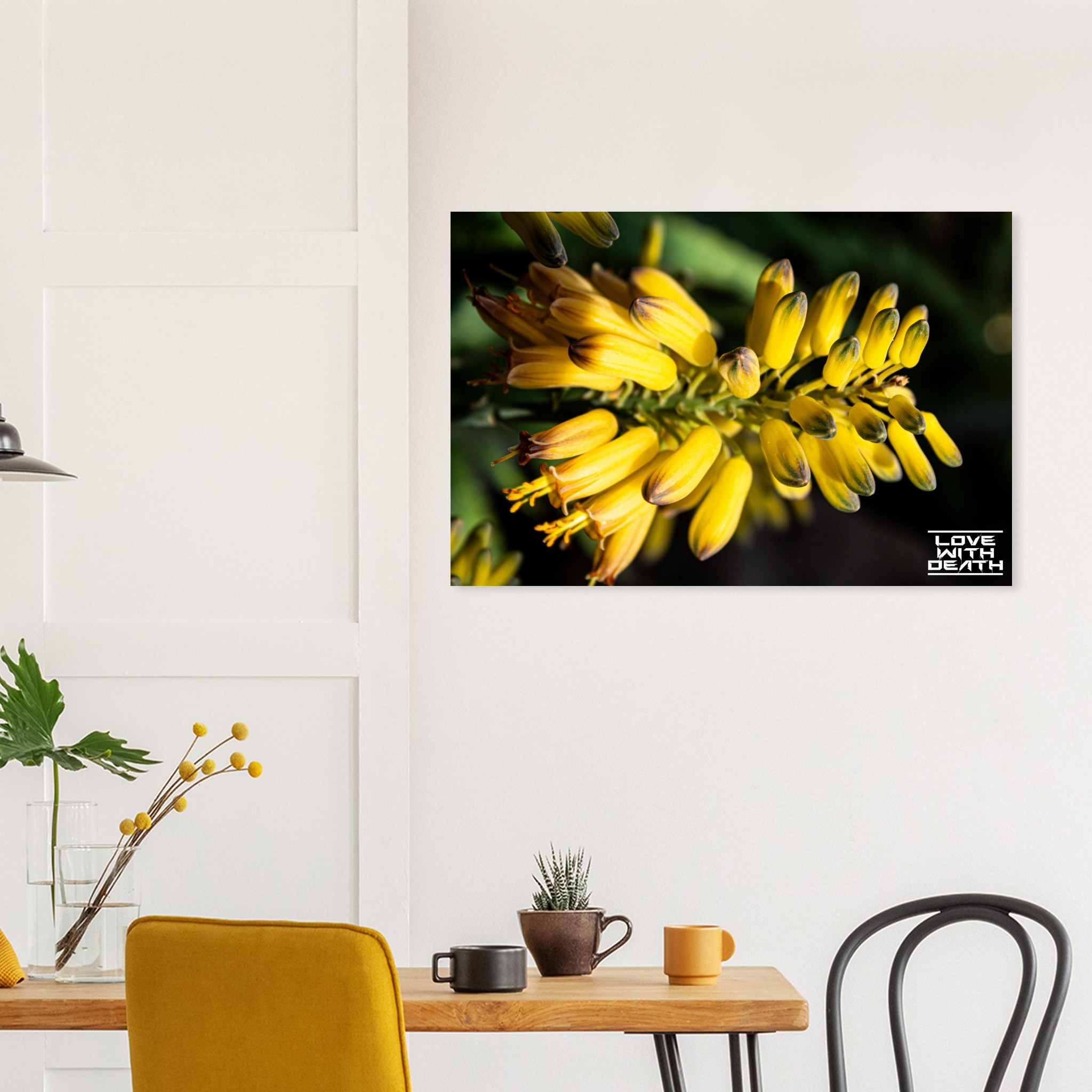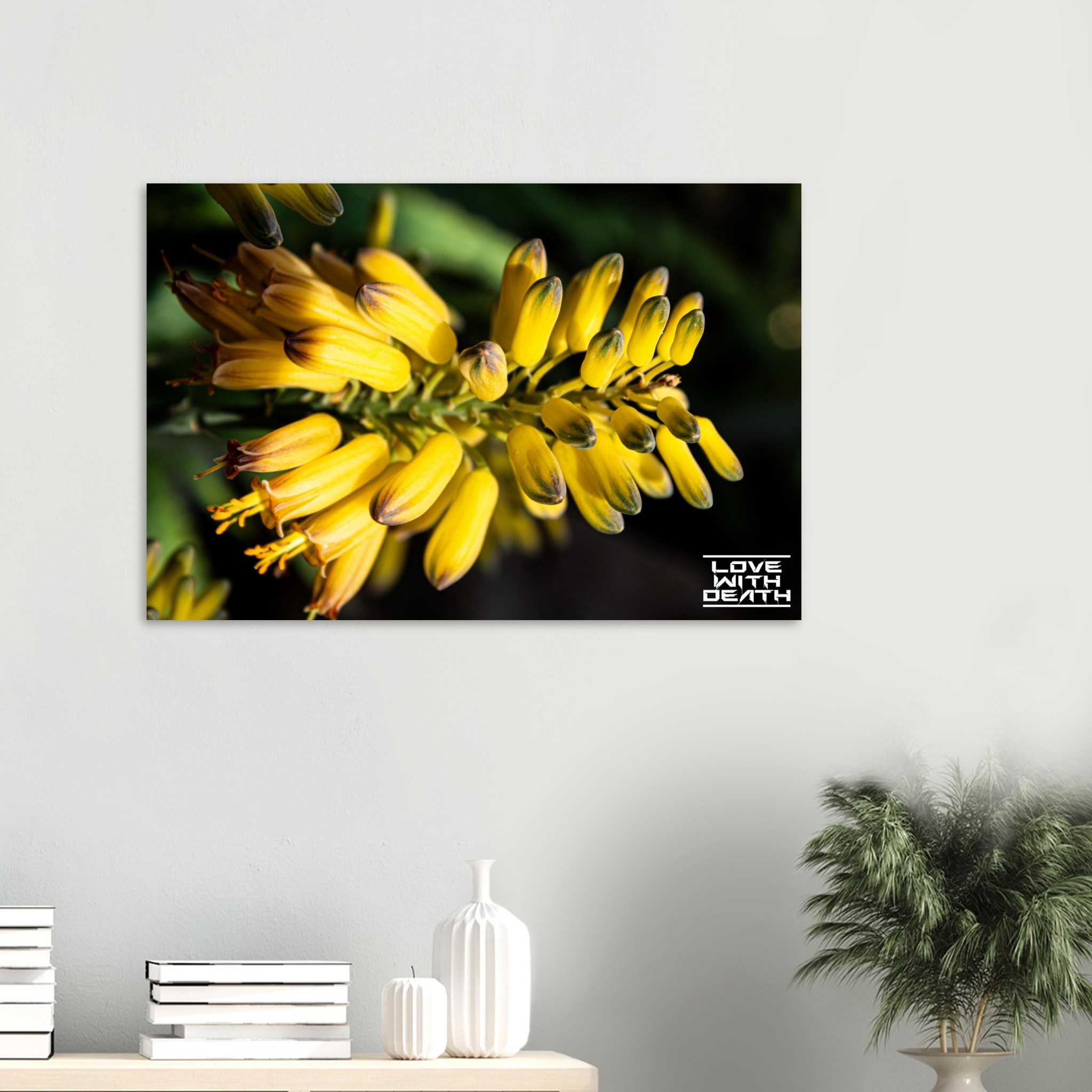 A macro photograph capturing the delicate elegance and vibrant colors of a yellow flower bud. The vivid yellow blooms gently curve towards openness, showcasing impressive color gradients that transition from soft green to a warm golden hue.