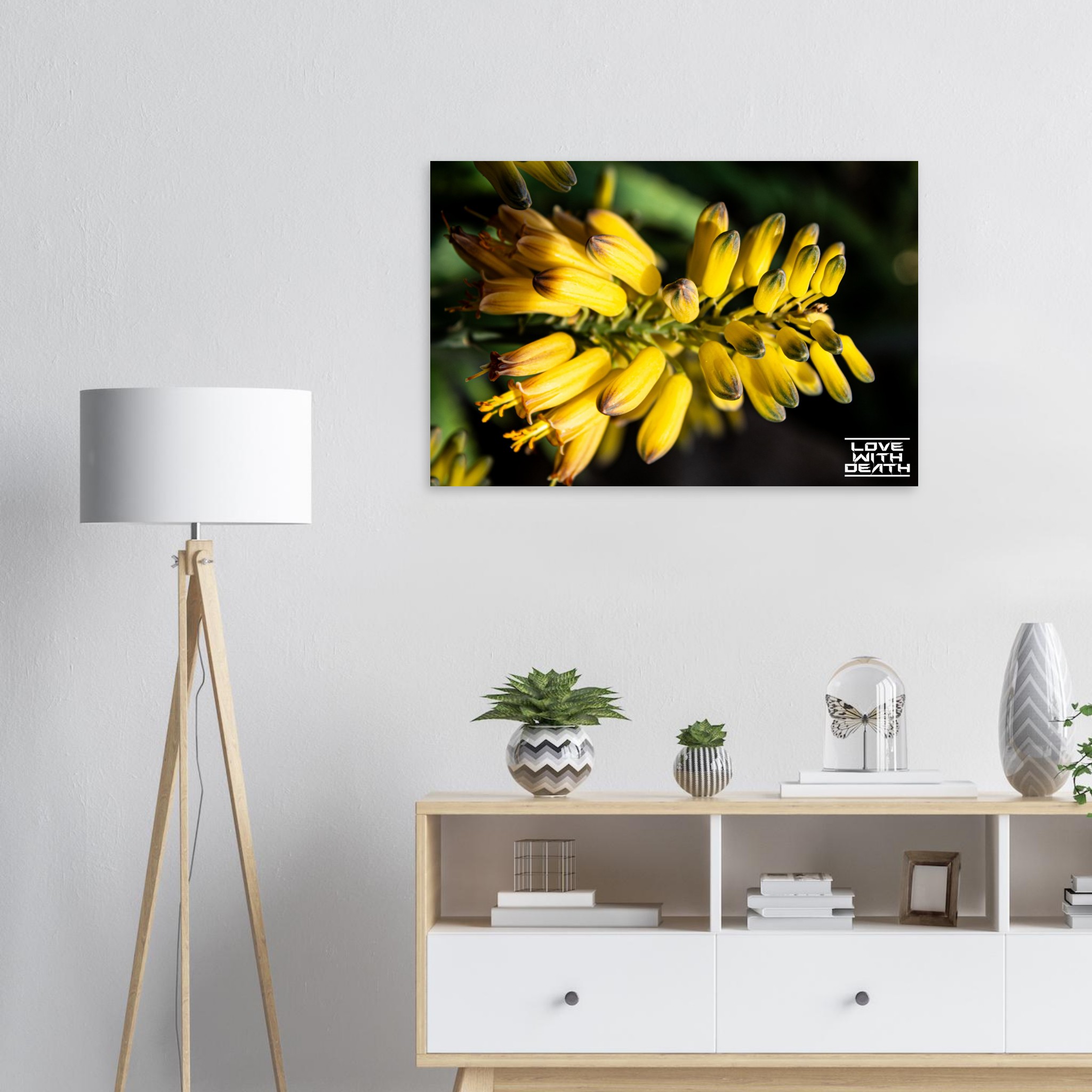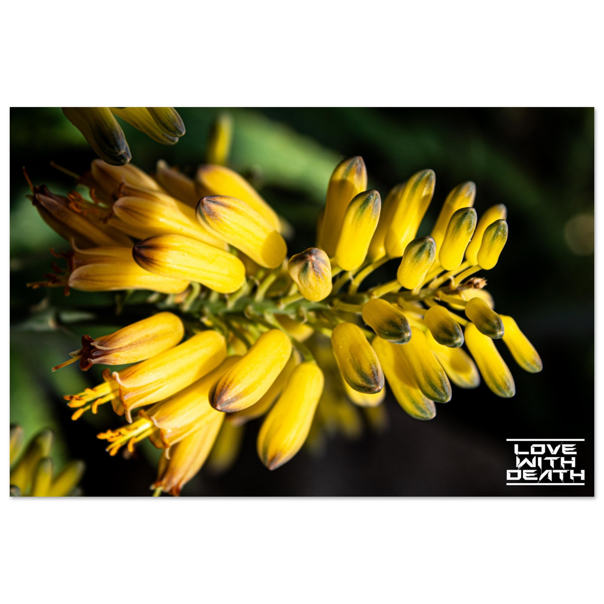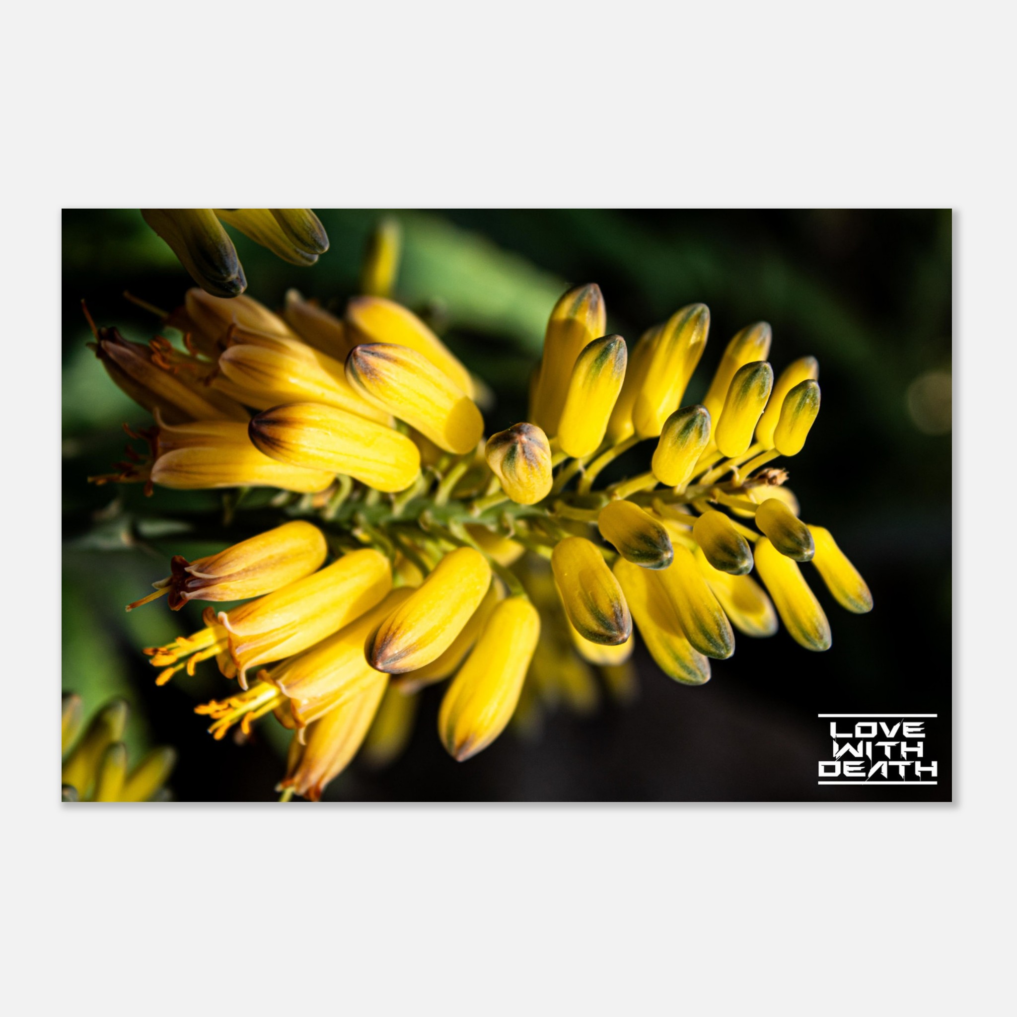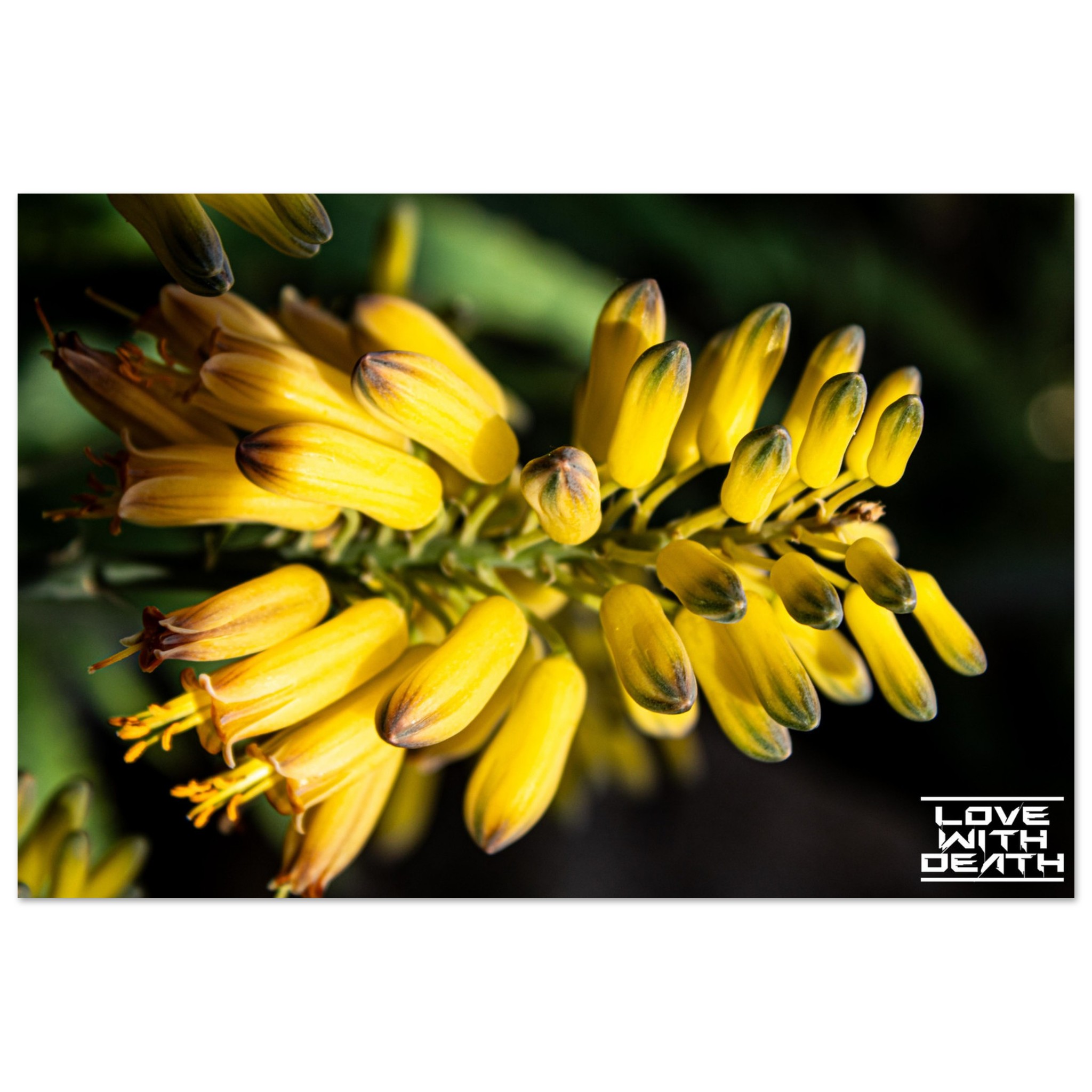 A macro photograph capturing the delicate elegance and vibrant colors of a yellow flower bud. The vivid yellow blooms gently curve towards openness, showcasing impressive color gradients that transition from soft green to a warm golden hue.